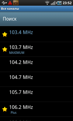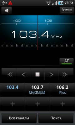 Программа управления встроенным FM-радиоприемником обладает простым и понятным интерфейсом. Доступные радиостанции могут быть найдены автоматически либо заданы прямым указанием частоты вручную. В нижней части окна находятся шесть ячеек для быстрого запоминания и включения радиостанций. Количество сохраненных в памяти радиостанций неограничено, в Москве программа находит 46 радиоканалов. Качество приема радиосигнала хорошее.