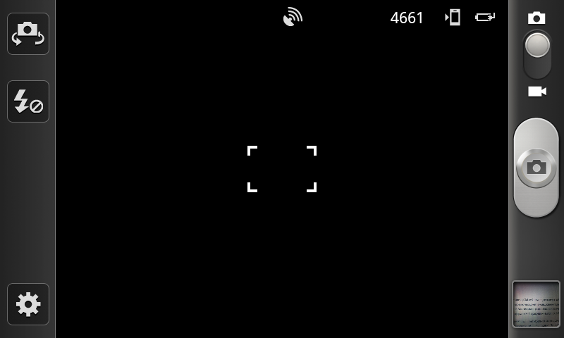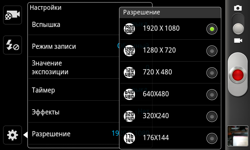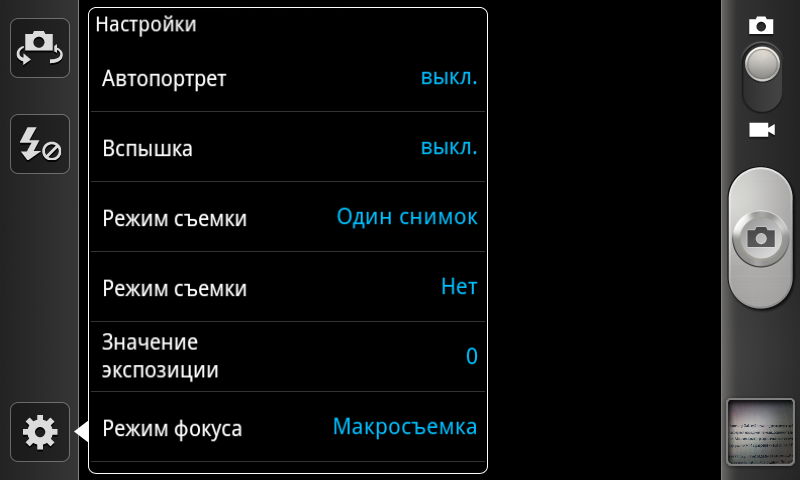 Интерфейс программы управления камерой легок в освоении: справа имеется переключатель режима работы камеры с видеосъемки на фото и обратно, а также крупная клавиша «спуска затвора», чуть ниже находится уменьшенное изображение последнего снимка, коснувшись которого можно попасть в фотоальбом. По левому краю окна программы расположены: переключатель между двумя камерами, кнопка управления работой вспышки и кнопка вызова основного меню настроек. Последнее организовано не самым удобным образом — в виде выпадающего длинного списка, который приходится долго прокручивать, чтобы добраться до нужного пункта. Краткий список настроек выглядит следующим образом: работа вспышки, режим съемки, коррекция экспозиции, работа автофокуса (автомат, макро, распознавание лиц), таймер, эффекты (негатив, сепия, оттенки серого), разрешение, баланс белого, ISO, экспозамер, стабилизация, качество изображения, теги GPS.