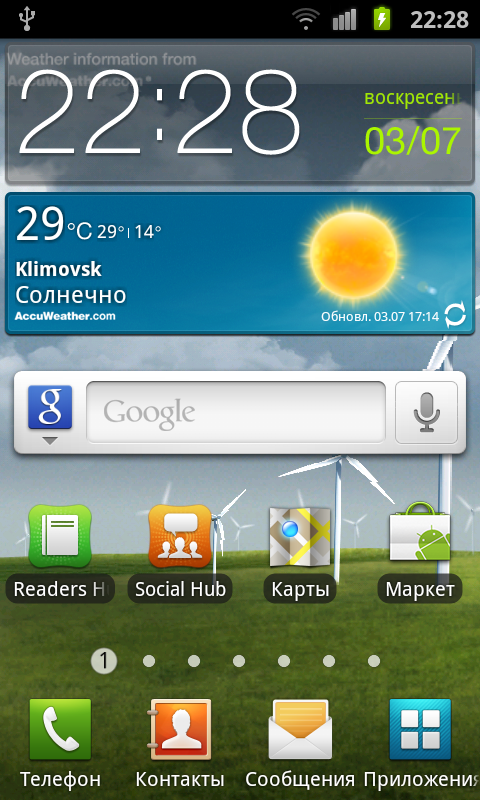 На страницах основного экрана системы присутствует небольшое число виджетов и иконок приложений. Среди них: часы, прогноз погоды, поиск Google, различные сервисы Google, Android Market, новости AP Mobile, почтовая программа Samsung, фоторамка, виджет с закладкой на любимую интернет-страницу (их может быть множество), котировки, Social Hub, Music Hub, Readers Hub, Game Hub. Все это размещается на трех страницах из семи, остальные четыре вкладки свободны.