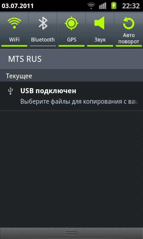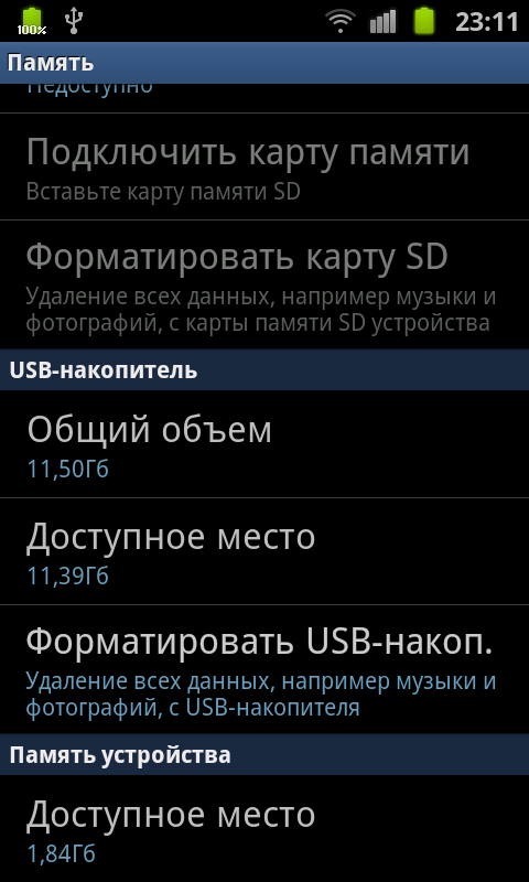 Гораздо более интересная технология, хоть и порядком подзабытая — USB-хост. Раньше, во времена расцвета КПК считалось нормой приличия встраивать эту функцию в свои устройства. С её помощью мобильный компьютер получал возможность считывать данные с флеш-накопителей, взаимодействовать с USB-клавиатурами и мышами. После исчезновения КПК из коммуникаторов исчез и USB-хост. В Samsung Galaxy S II он появился снова, правда под другим именем и с урезанной функциональностью. USB On-The-Go (OTG) позволяет коммуникатору работать с USB-накопителями: на основе флеш-памяти или жесткими дисками. Подключаемое устройство должно иметь файловую систему FAT32. Жаль только, что в комплекте с коммуникатором не было соответствующего кабеля. Информация о поддержке других устройств: мышей, клавиатур, джойстиков — противоречива. В любом случае, их можно успешно подключить по Bluetooth.