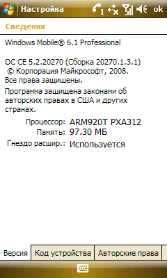 - Операционная система Microsoft Windows Mobile 6.1 Professional (сборка 20270.1.3.1);