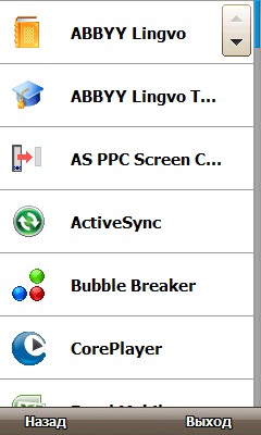 Одна из иконок уже упомянутого меню приложений и операций открывает список всех установленных программ. Ярлыки упорядочены по вертикали в алфавитном порядке, список прокручивается при помощи пассов пальцем вверх и вниз. Разработчики коммуникатора сделали все от них возможное, чтобы обеспечить прокрутку различных окон и списков при помощи движений пальцем. При аккуратном обращении с интерфейсом это удаётся без проблем, но иногда вместо прокрутки система воспринимает прикосновения пальца как нажатия и делает совсем не то, чего от нее ожидали.