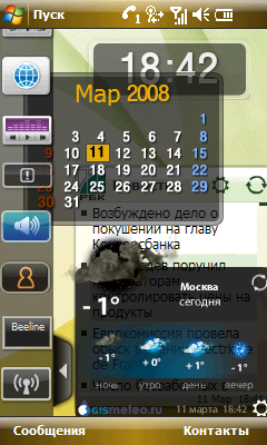 Встроенное программное обеспечение в Samsung WiTu многочисленно и разнообразно. Разработчики коммуникатора постарались на славу в попытке избавить пользователя от какого-либо взаимодействия со стандартным интерфейсом и утилитами Windows Mobile. Так, одинх лишь замен для экрана Today подготовлено 3 варианта.