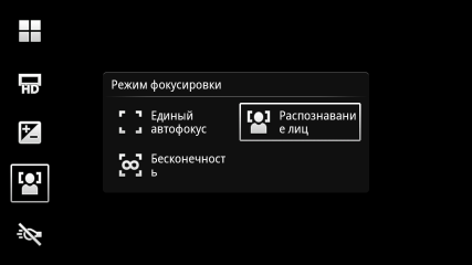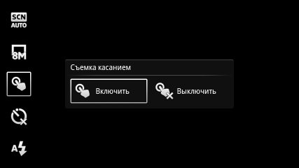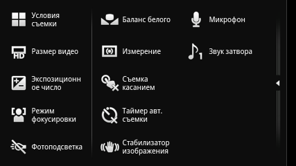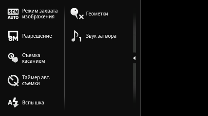 Программа управления съемкой проста и удобна. На экране отображаются основные настройки камеры в виде иконок, рядом находится список уменьшенных копий полученных снимков. При касании иконки появляется меню выбора настроек, а при касании снимка запускается его просмотр. Следующие настройки камеры доступны изначально: режим захвата изображения (обычный, распознавание условий, распознавание улыбки), разрешение, съемка касанием, таймер, вспышка, условия съемки, коррекция экспозиции, режим фокусировки (единый, распознавание лиц, бесконечность). В дополнительном меню можно изменить остальные настройки: баланс белого, измерение баланса, стабилизатор изображения, навигационный штамп.