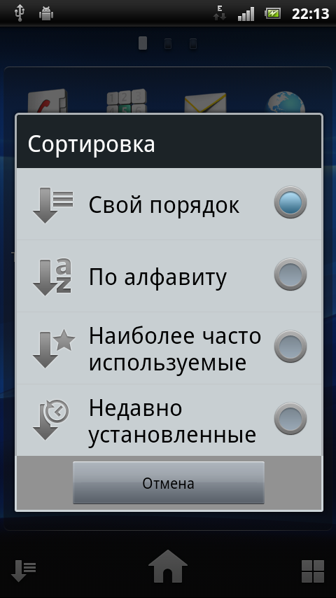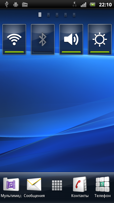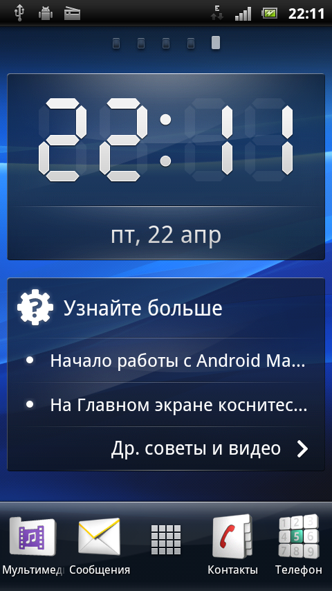 В нижней части экрана постоянно находятся иконки наиболее нужных, опять же с точки зрения разработчиков, приложений, а также кнопка вызова списка всех установленных программ. Набор ярлыков можно менять по своему усмотрению, но их может быть максимум четыре. По умолчанию это: библиотека мультимедиа, сообщения, контакты и телефон.