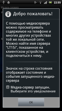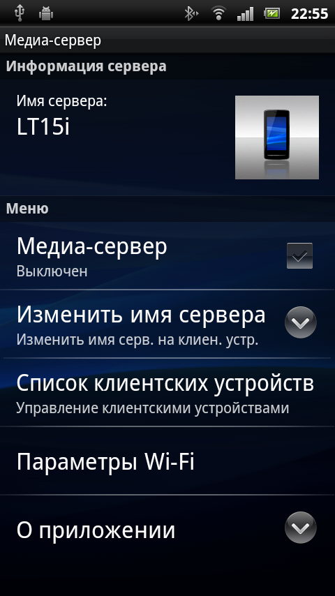 В Xperia Arc реализована поддержка протокола DLNA, который используется для организации локальных сетей обмена медиафайлами. Для управления этой возможностью в мобильном компьютере установлено специальное приложение Media Server, которое может разместить в общем доступе музыку, видео и фотографии из внутренней памяти коммуникатора или подключиться к внешним ресурсам.