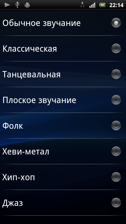 Регулирование громкости звука, исходящего из любого источника Xperia Arc, проще всего осуществлять с помощью двух аппаратных клавиш на правом торце корпуса устройства. Программный эквалайзер можно обнаружить в штатном аудиоплеере, но он позволяет лишь выбрать один из нескольких заранее предустановленных режимов обработки звука. Самостоятельно настраивать уровни сигнала нельзя.