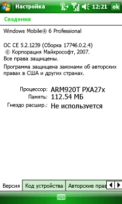 - Операционная система Windows Mobile 6.0 Professional (CE 5.2.1239 сборка 17746.0.2.4)
