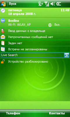 Коммуникатор работает под управлением операционной системы Windows Mobile 6 Professional. На главном экране системы никаких дополнительных индикаторов или приложений нет. Все добавочные утилиты собраны в меню программ операционной системы и запускаются по требованию. Это способствует уменьшению расхода как оперативной, так и постоянной памяти. Все необходимое программное обеспечение пользователь сможет запустить (или добавить) самостоятельно. К примеру, в ПЗУ записана Opera мобильная версия одного из лучших интернет браузеров.