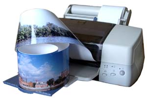 Эти картриджи можно снимать с принтера после частичного использования, а затем вновь устанавливать. Так, при печати больших панорам вы можете установить свежий картридж, а потом вернуться к частично израсходованному. А панорамы на принтере можно печатать действительно гигантские. Хотя принтер А4, но на него можно дополнительно установить держатель рулонной бумаги и печатать за 1 прием панорамы длиной до 10 м.
