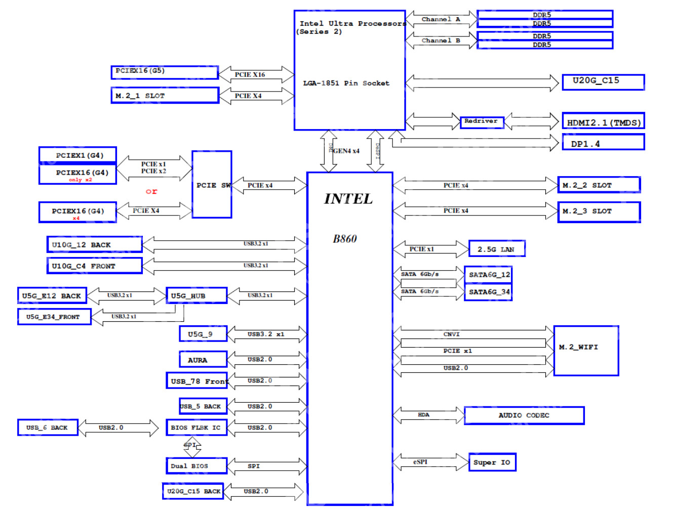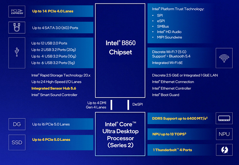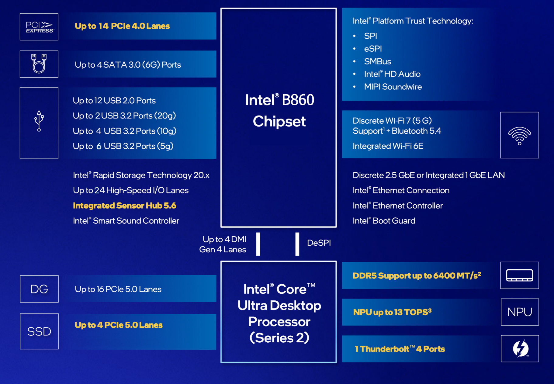 При этом взаимодействие с B860 идет по особому каналу Digital Media Interface 4.0 (DMI 4.0 x4). Serial Peripheral Interface (SPI) используется для взаимодействия с системой UEFI/BIOS, а шина Low Pin Count (LPC) — для связи с устройствами ввода/вывода, не требующими высокой пропускной способности (контроллерами вентиляторов, TPM, старой периферии). HDA более не используется, связь с аудиокодеками идет с помощью линий USB 2.0.