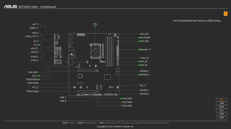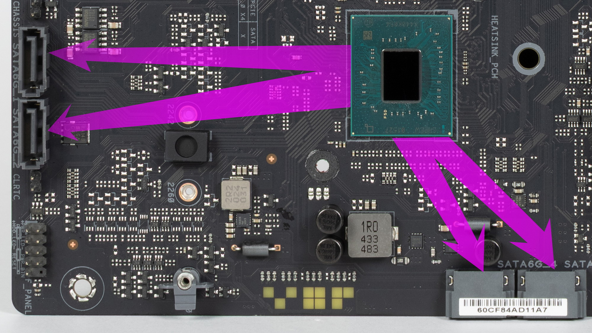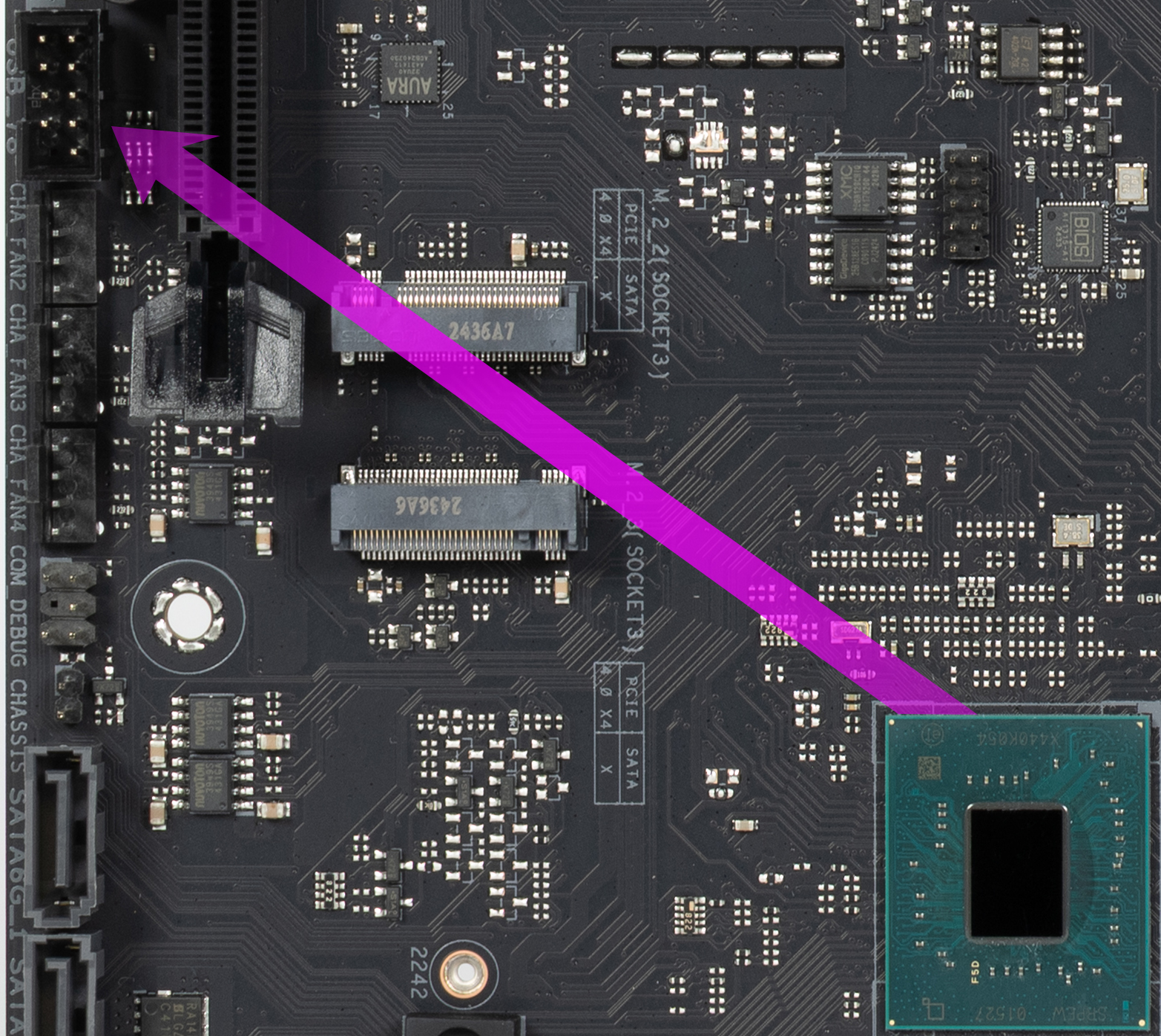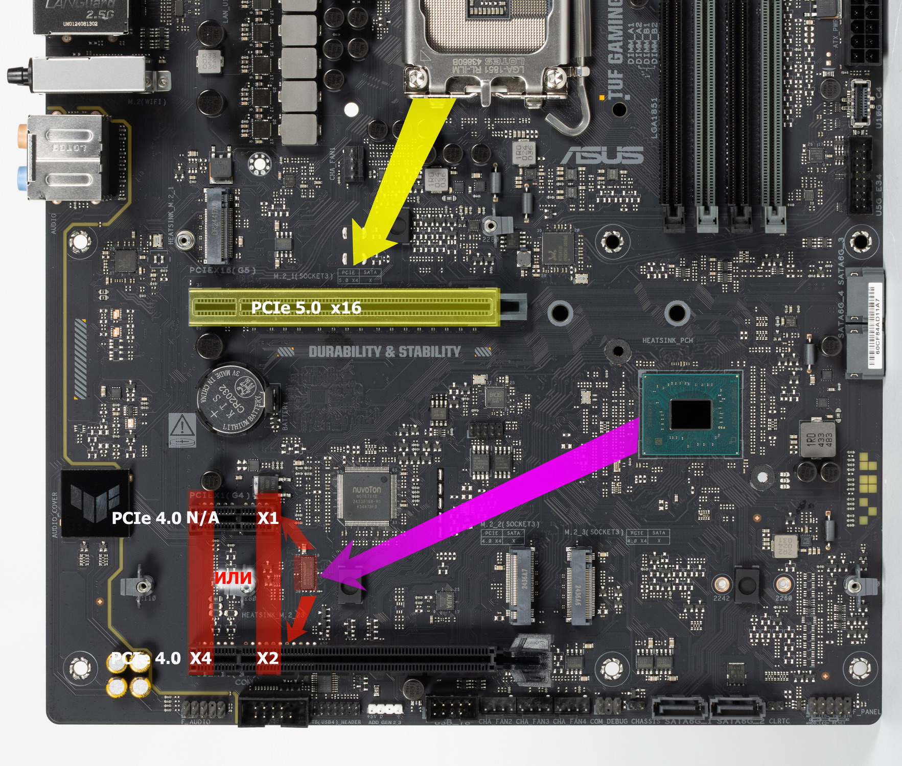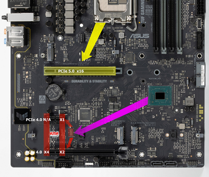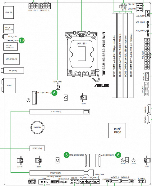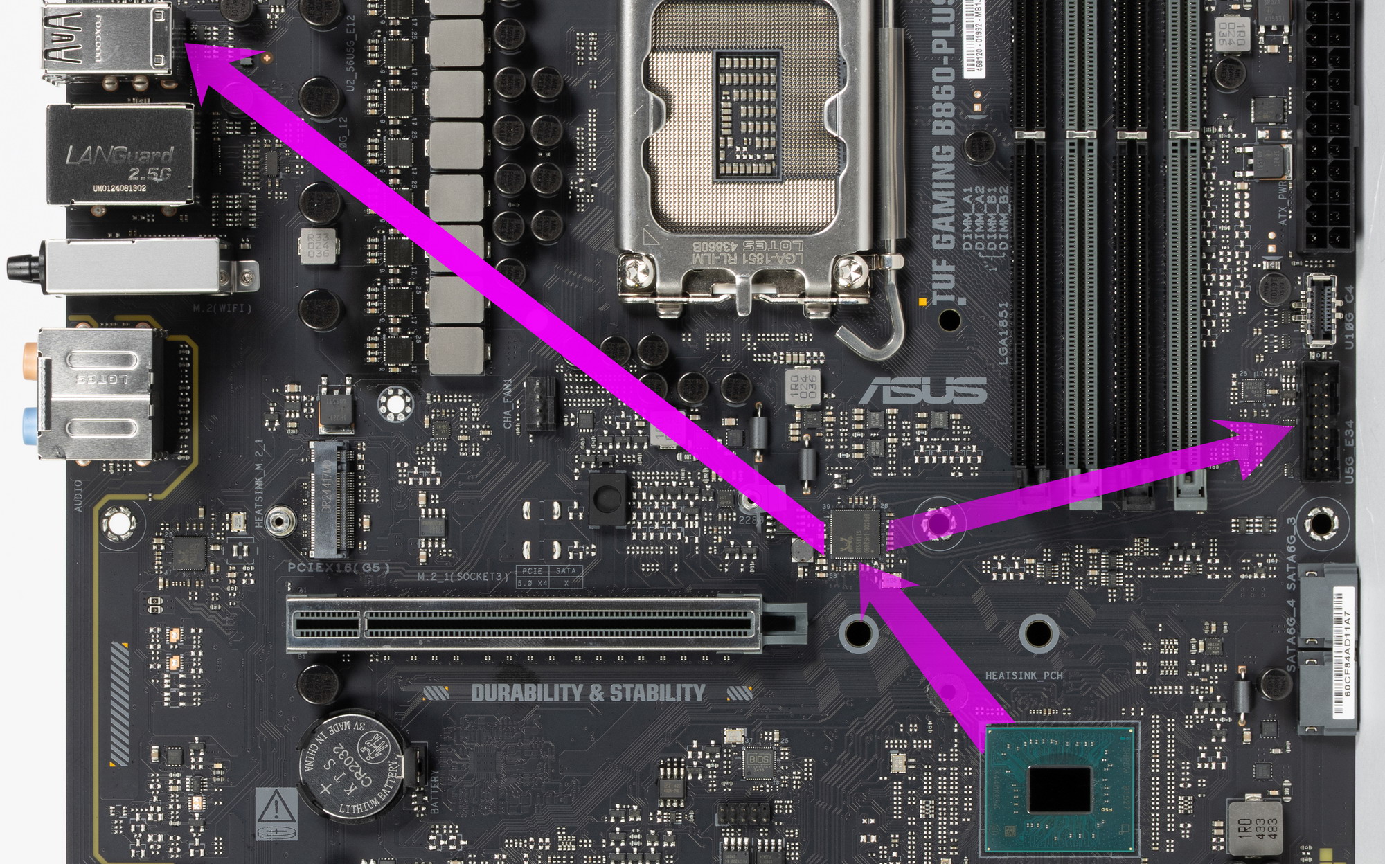 Кроме USB-портов, к которым мы подойдем позже, чипсет B860 обладает 14 PCIe линиями PCIe 4.0 и 4 SATA портами. Считаем, сколько линий B860 уходит на поддержку (связь) с тем или иным элементом: