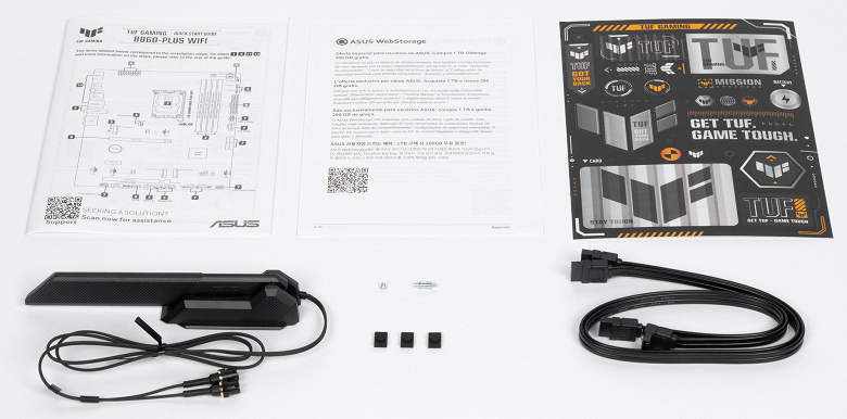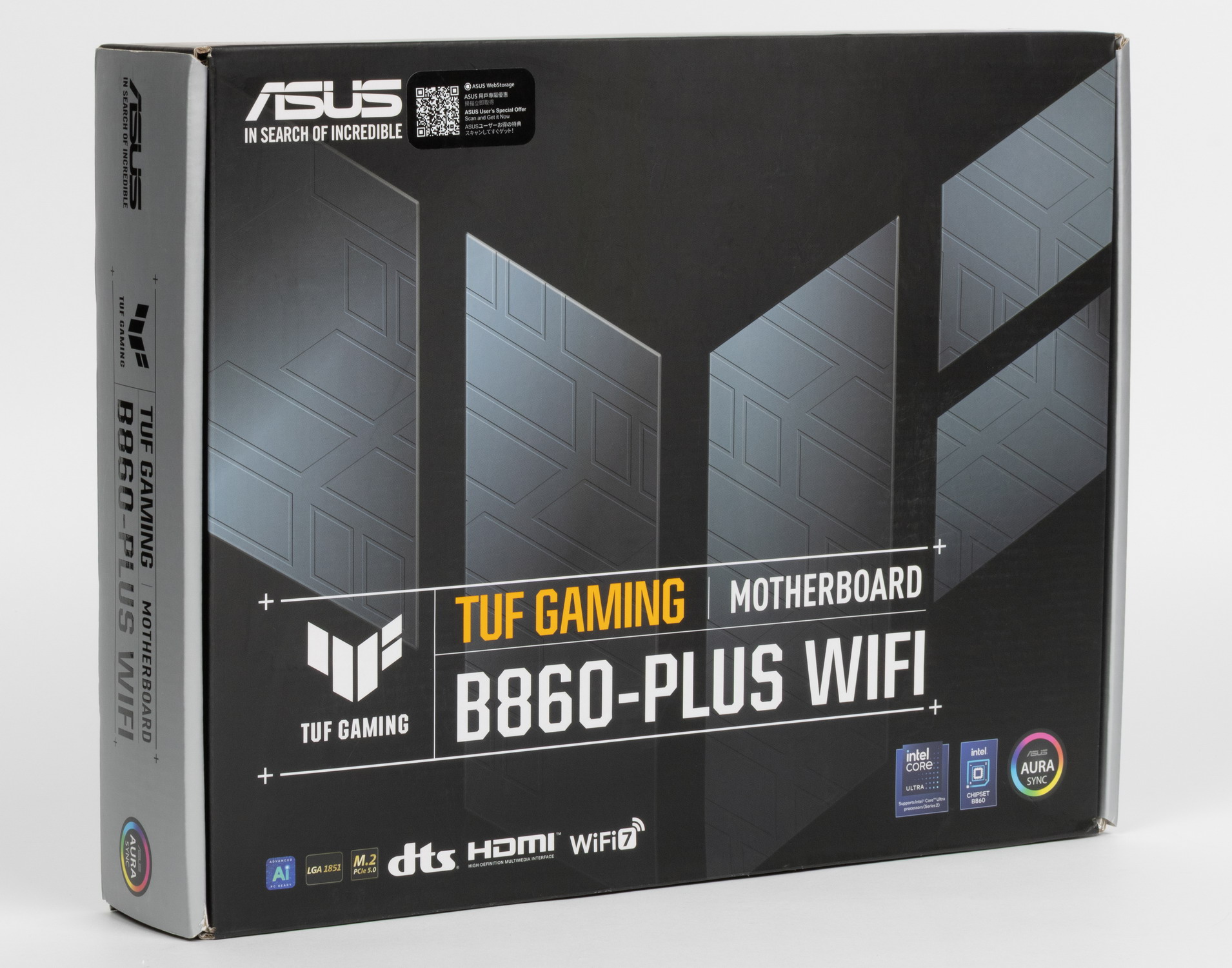 Asus TUF Gaming B860-Plus WiFi поставляется в коробке стандартного дизайна серии TUF Gaming. Комплект размещен под платой в отдельном отсеке.