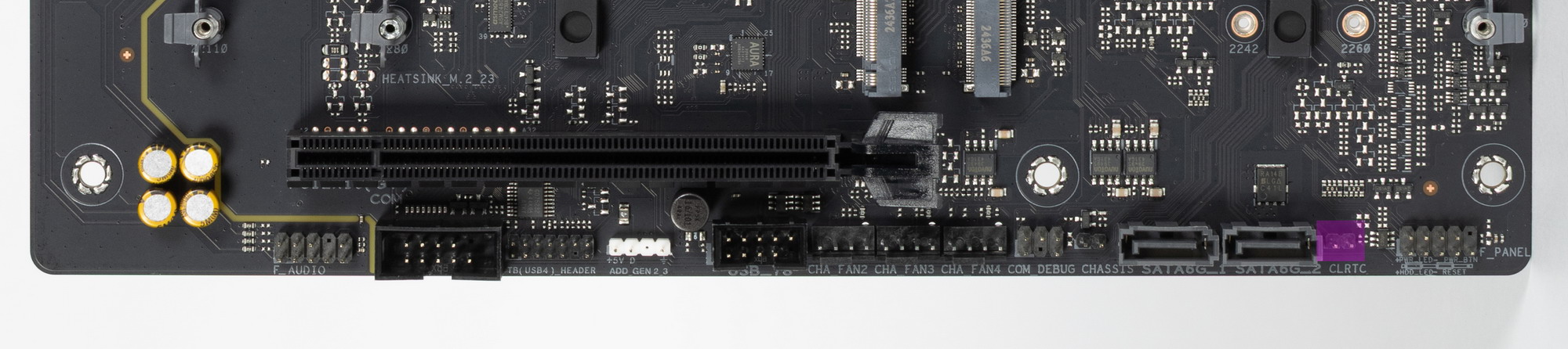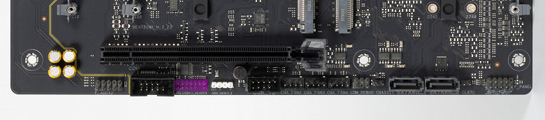 Всего на плате есть 3 слота: слот PCIe x16_1 (для видеокарт или других устройств), слот PCIe x1 и «длинный» PCIe x16_2 слот (но фактически имеющий 4 линии PCIe 4.0). Два последних слота делят линии между собой: при занятости PCIe x1 слот PCIe x16_2 получает не 4, а всего 2 линии PCIe 4.0, и наоборот, при занятости последнего (4 линии PCIe 4.0), слот PCIe x1 отключен.