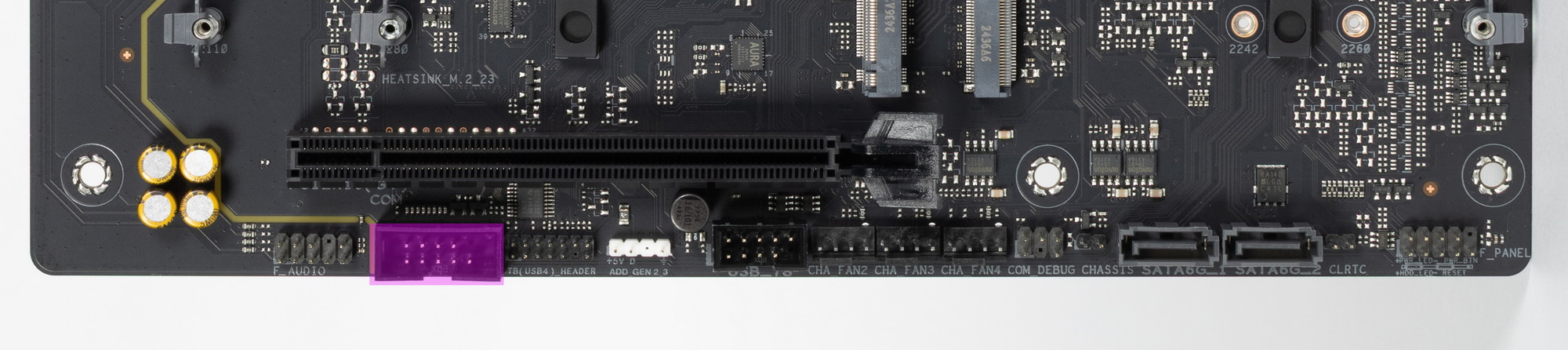 USB порт 3.2 Gen2 в виде внутреннего Type-C позволяет выдавать вольтаж, способный обеспечить быструю зарядку мобильных гаджетов. Также и порт USB 3.2 Gen2x2 Type-C на задней панели оснащен ре-драйверами.