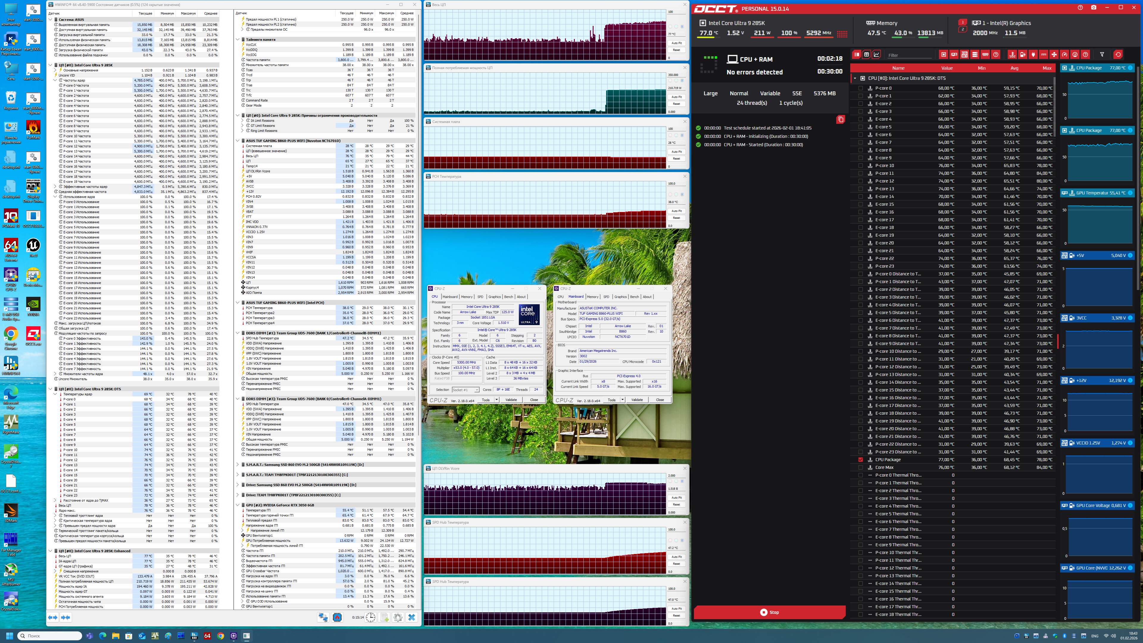 В режиме авторазгона мы получили до 5,3 ГГц по P-ядрам, и 4.6 ГГц по всем Е-ядрам. Напомню, что начиная с этого поколения процессоров, все ядра имеют по 1 потоку, то есть гипертрейдинга (многопоточности) теперь нет. Потребление процессора достигало 210 Вт. Отмечу, что профиль в BIOS – тот, что рекомендует Intel.