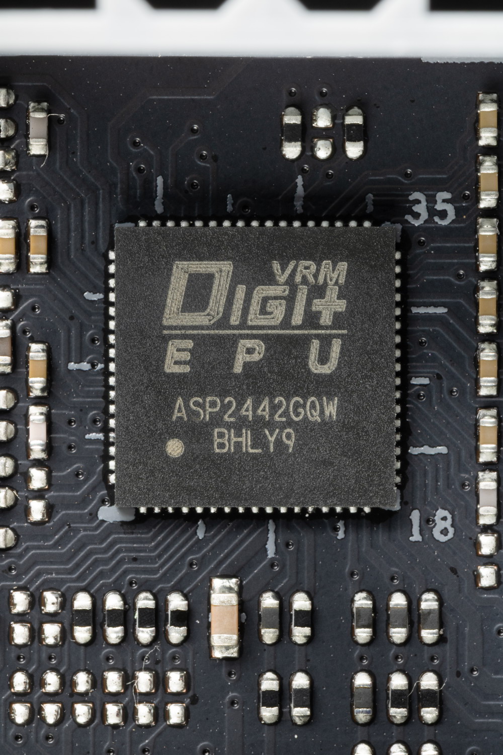 Управление схемой VCore+VNNAON+VCCSA возложено на фирменный ШИМ-контроллер Digi+ ASP2442.
