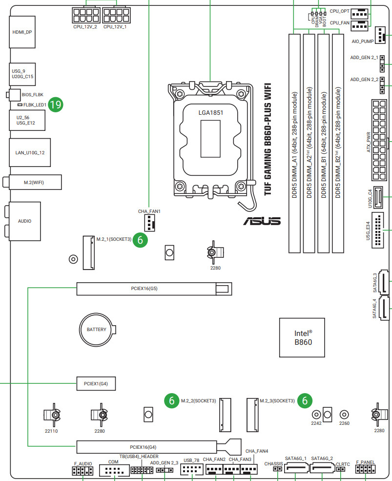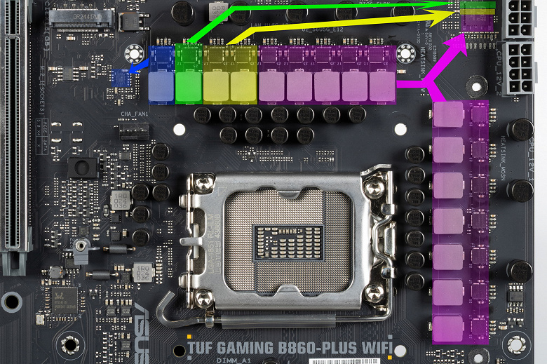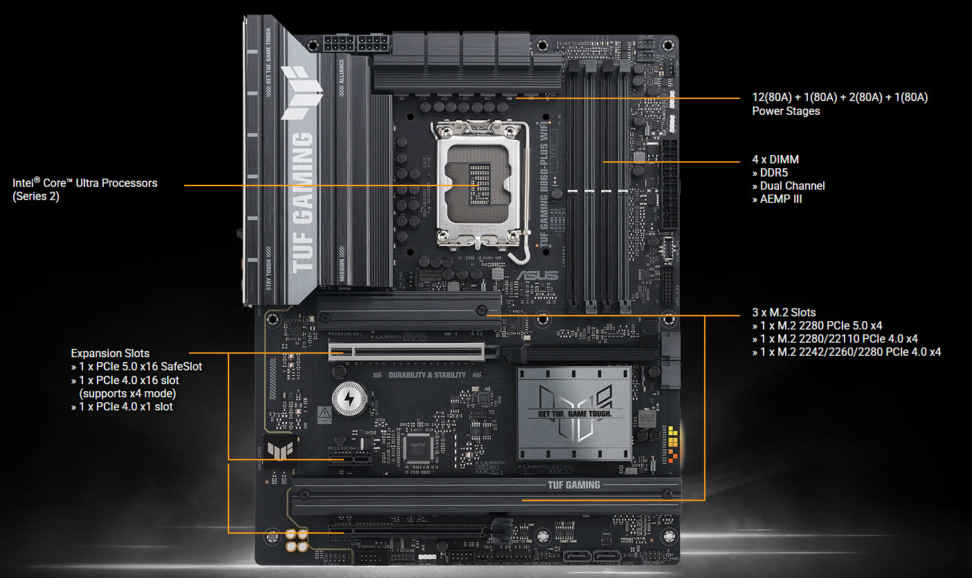 Asus TUF Gaming B860-Plus WiFi поддерживает процессоры Intel Core Ultra 2xx, выполненные под разъем (сокет) LGA1851.