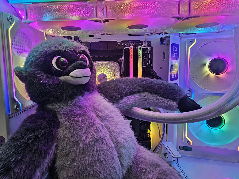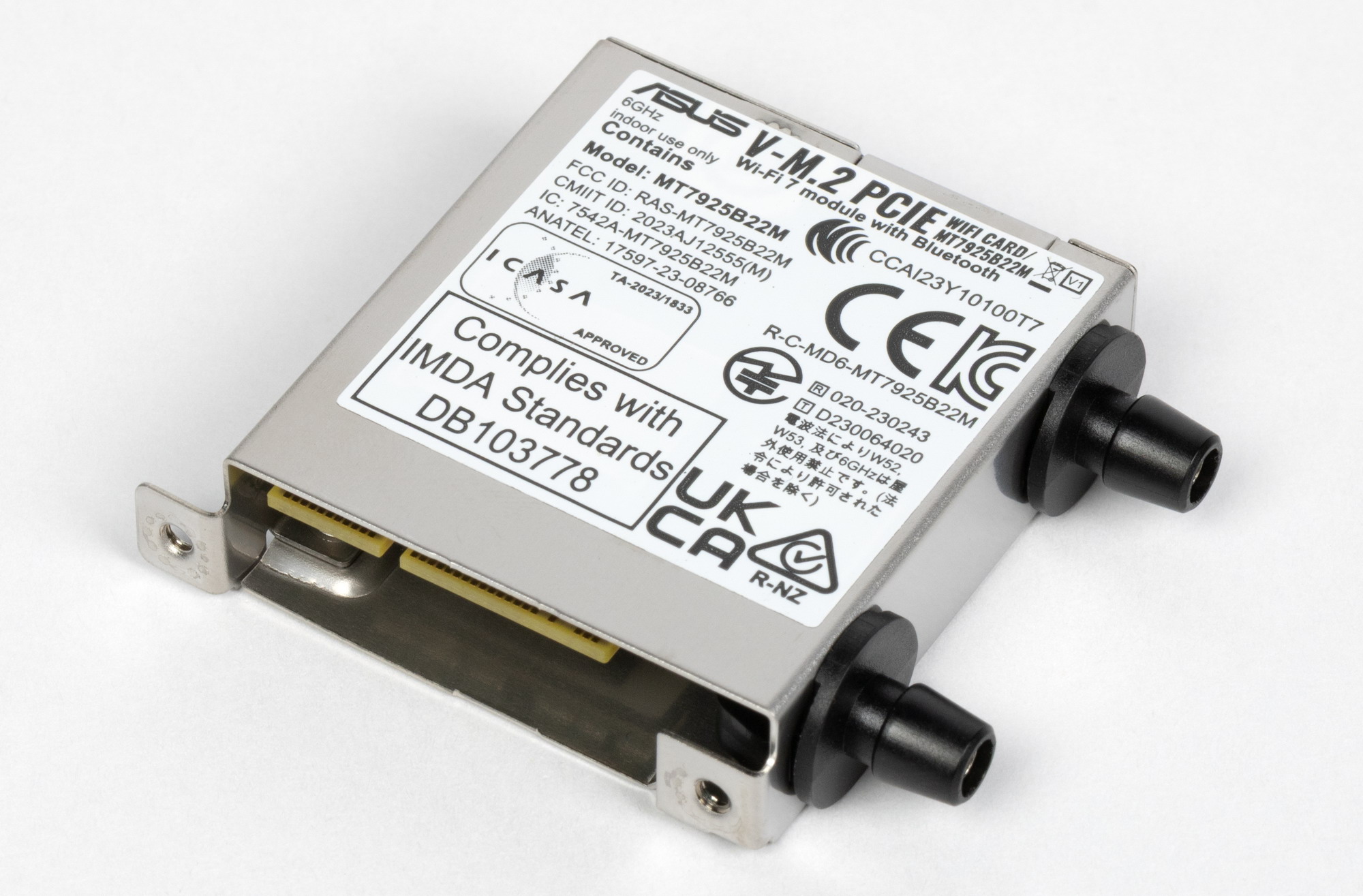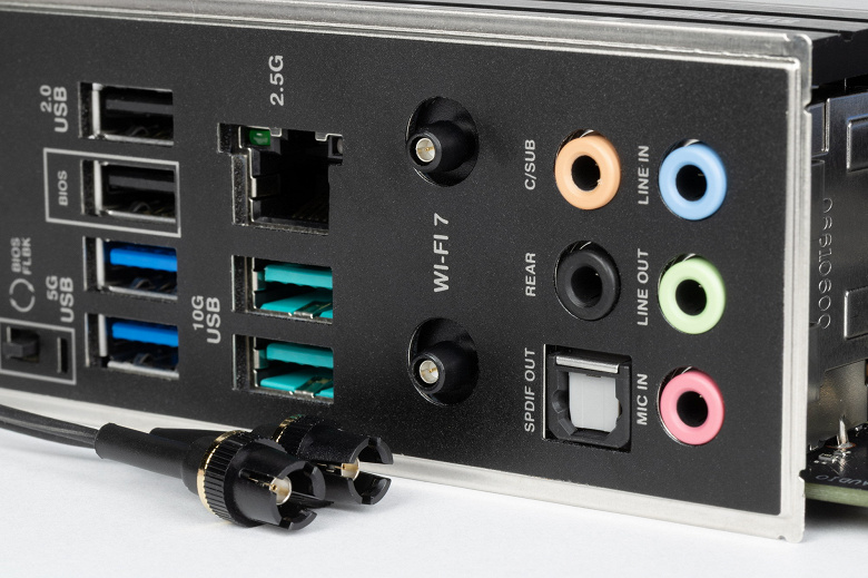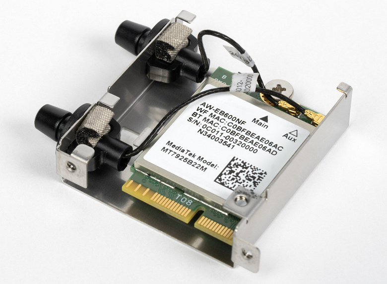 Имеется и комплексный беспроводной адаптер на контроллере MediaTek MT7925, через который реализованы Wi-Fi 7 (802.11a/b/g/n/ac/ax/be, 2,4/5/6 ГГц) и Bluetooth 5.4. Он установлен в слот M.2 (E-key), и его разъемы для выносных антенн выведены на заднюю панель.