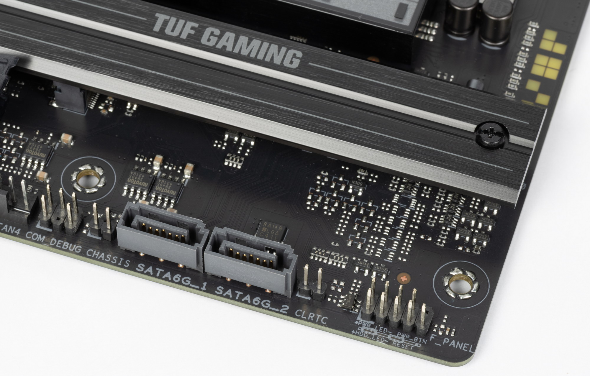 Всего у платы 4 разъема Serial ATA 6 Гбит/с + 3 слота для накопителей в форм-факторе M.2. 4 порта SATA 1,2,3,4 реализованы через чипсет B860. Порты размещены по-парно по углам матплаты, при этом SATA 1/2 ориентированы вертикально.