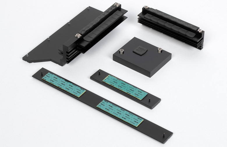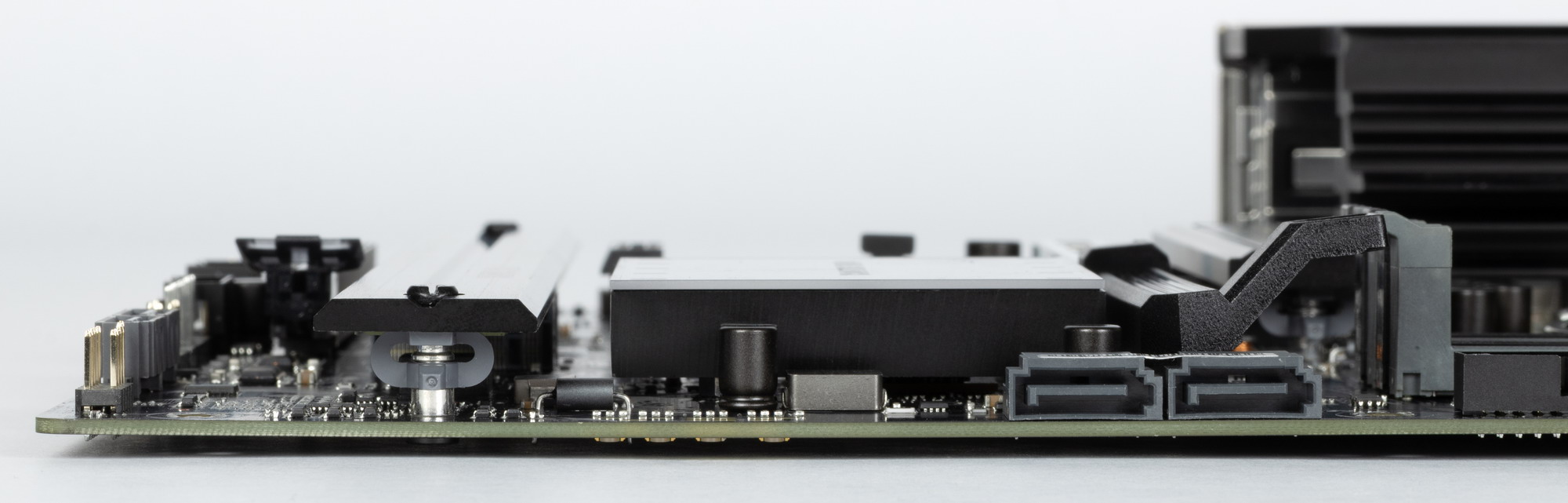 Все M.2 слоты имеют радиаторы. M.2_1 обладает отдельным радиатором, когда как остальные все слоты M.2 имеют общий радиатор. Охлаждение тыльной стороны модулей не предусмотрено.