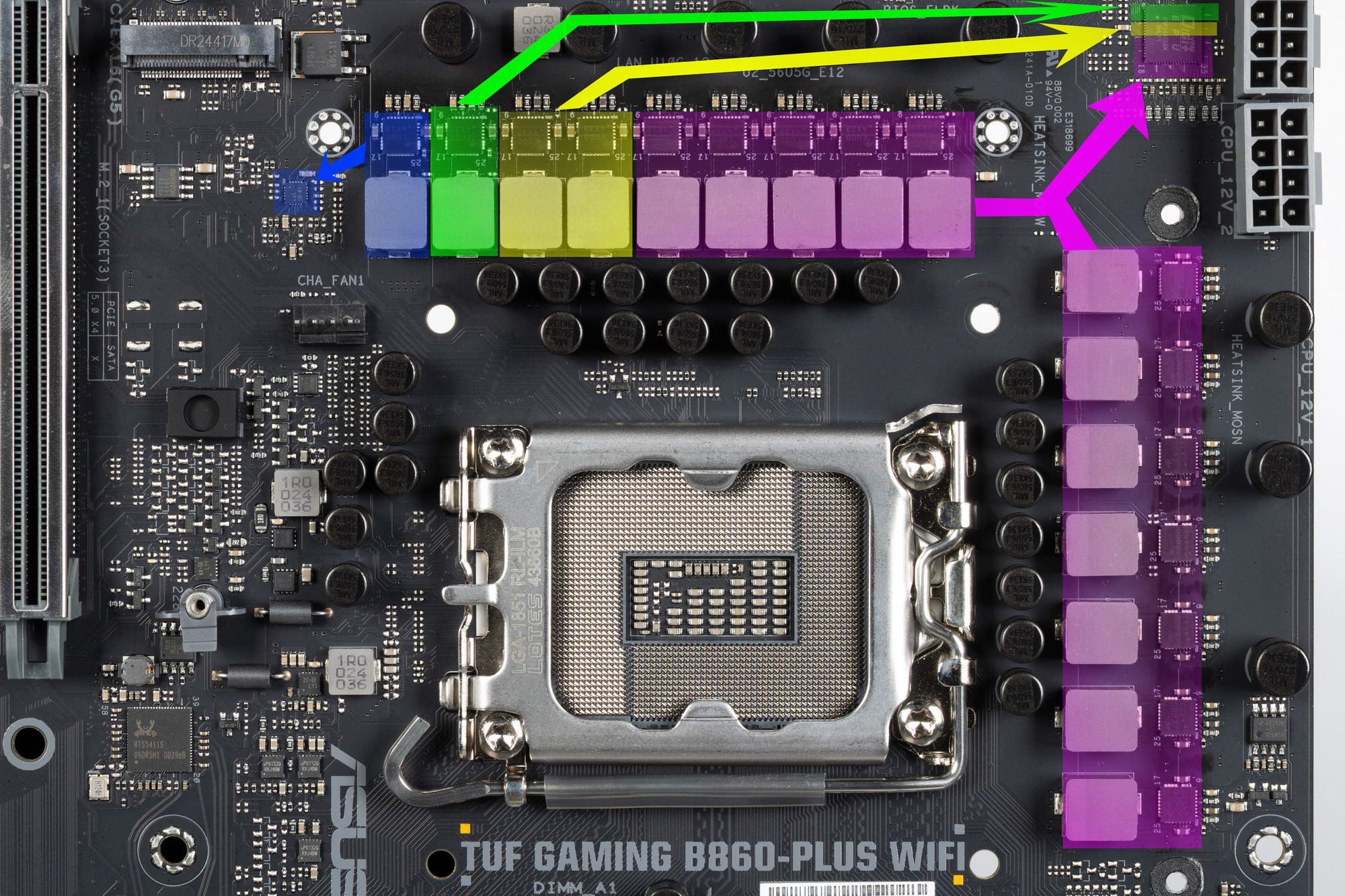 Схема питания процессора выполнена по схеме 12+1+2+1 (всего 16 фаз: 12 на VCore (ядро процессора), 1 на iGPU (интегрированное графическое ядро), 2 на VCCSA (System Agent, кольцевая шина) и 1 на VNNAON (управление энергосбережением).