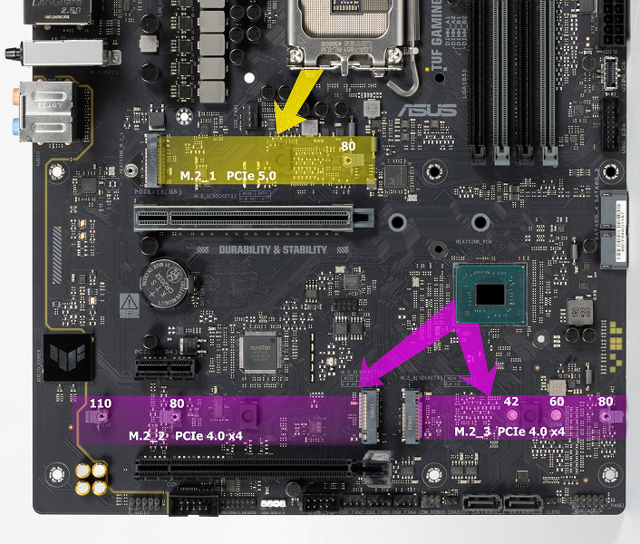 Второй и третий слоты M.2 (M.2_2, M.2_3) получают данные от чипсета B860, а первый — от CPU, при этом M.2_1 получает PCIe 5.0, а M.2_2/3 получают PCIe 4.0.