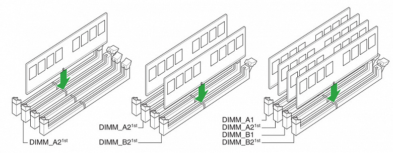 Для установки модулей памяти на плате Asus имеется четыре DIMM-слота (для работы памяти в Dual Channel в случае использования всего 2 модулей их следует устанавливать в А2 и B2 (отмечены серым цветом).