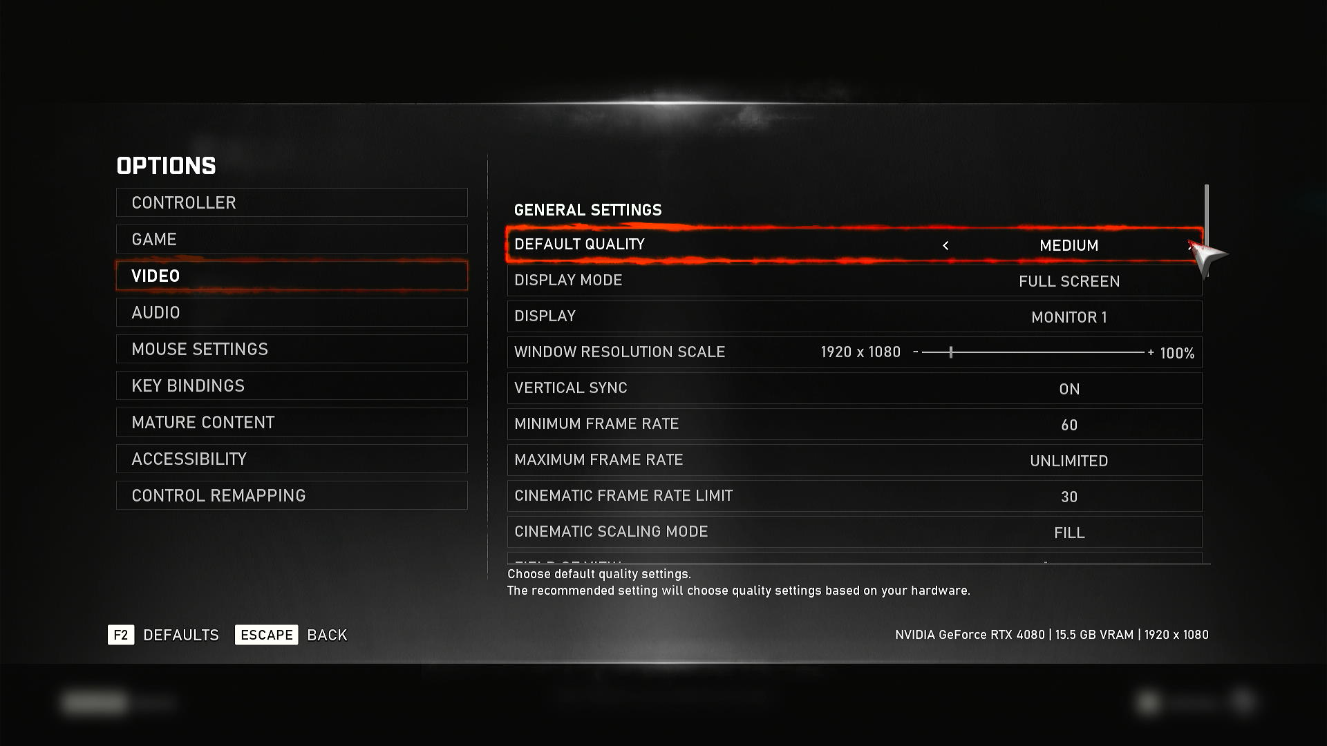 Устанавливаем разрешение 1920×1080 и среднее качество (Quality: Medium).