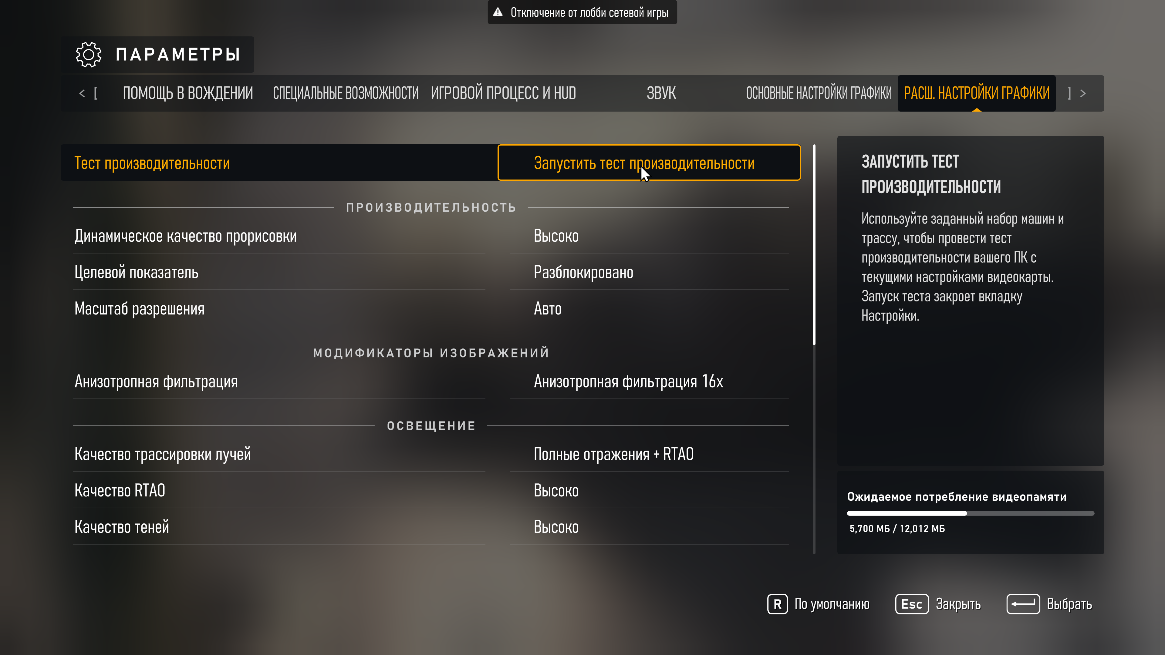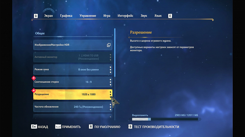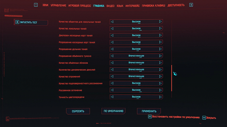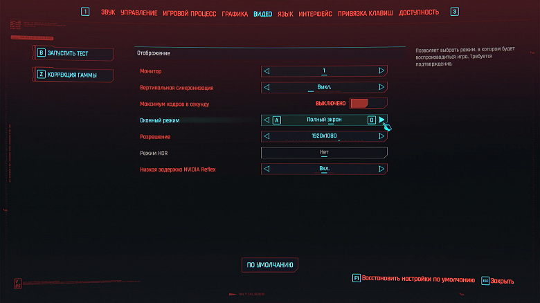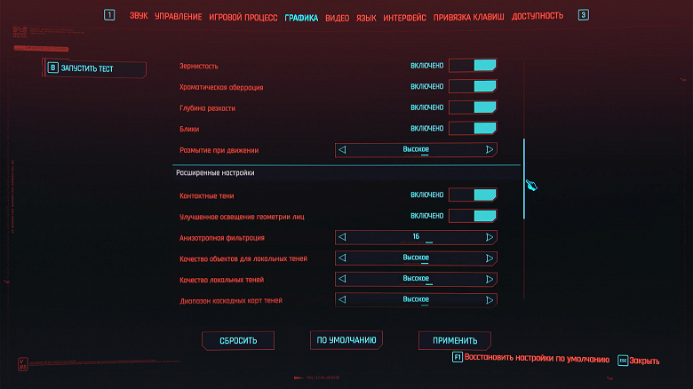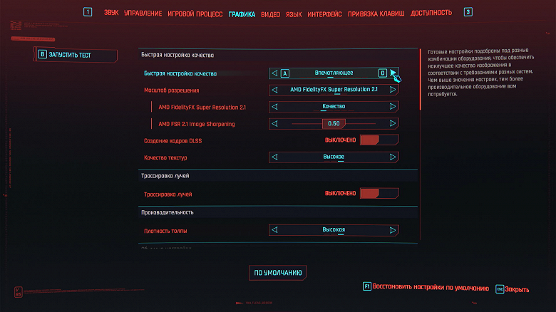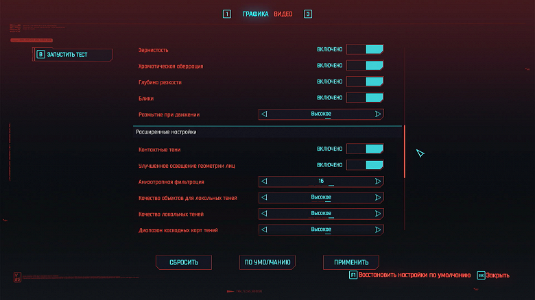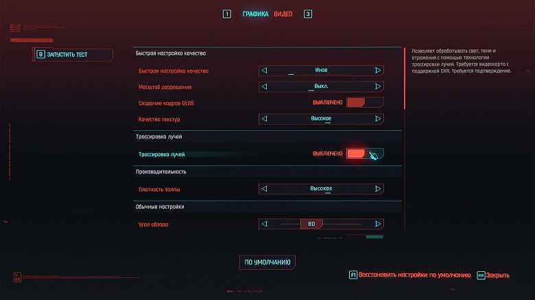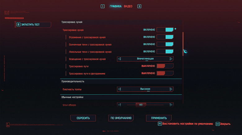 Ползунком сверху устанавливаем разрешение 1920×1080 (выбор по умолчанию). Сглаживание и тени с трассировкой лучей должны быть выключены. Кликаем на красное поле «Тест».