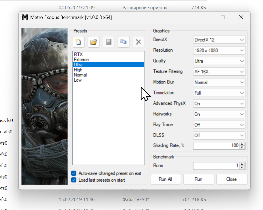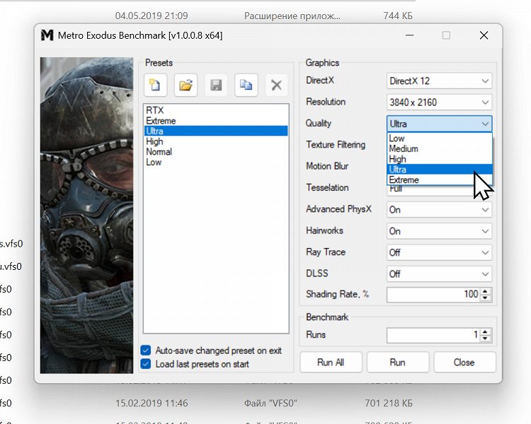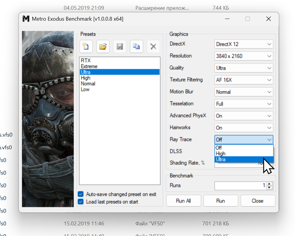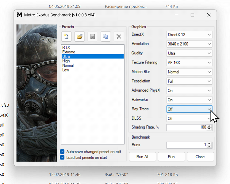 Включаем опцию «Тени с трассировкой лучей» на «Ультра». Запускаем прогон.