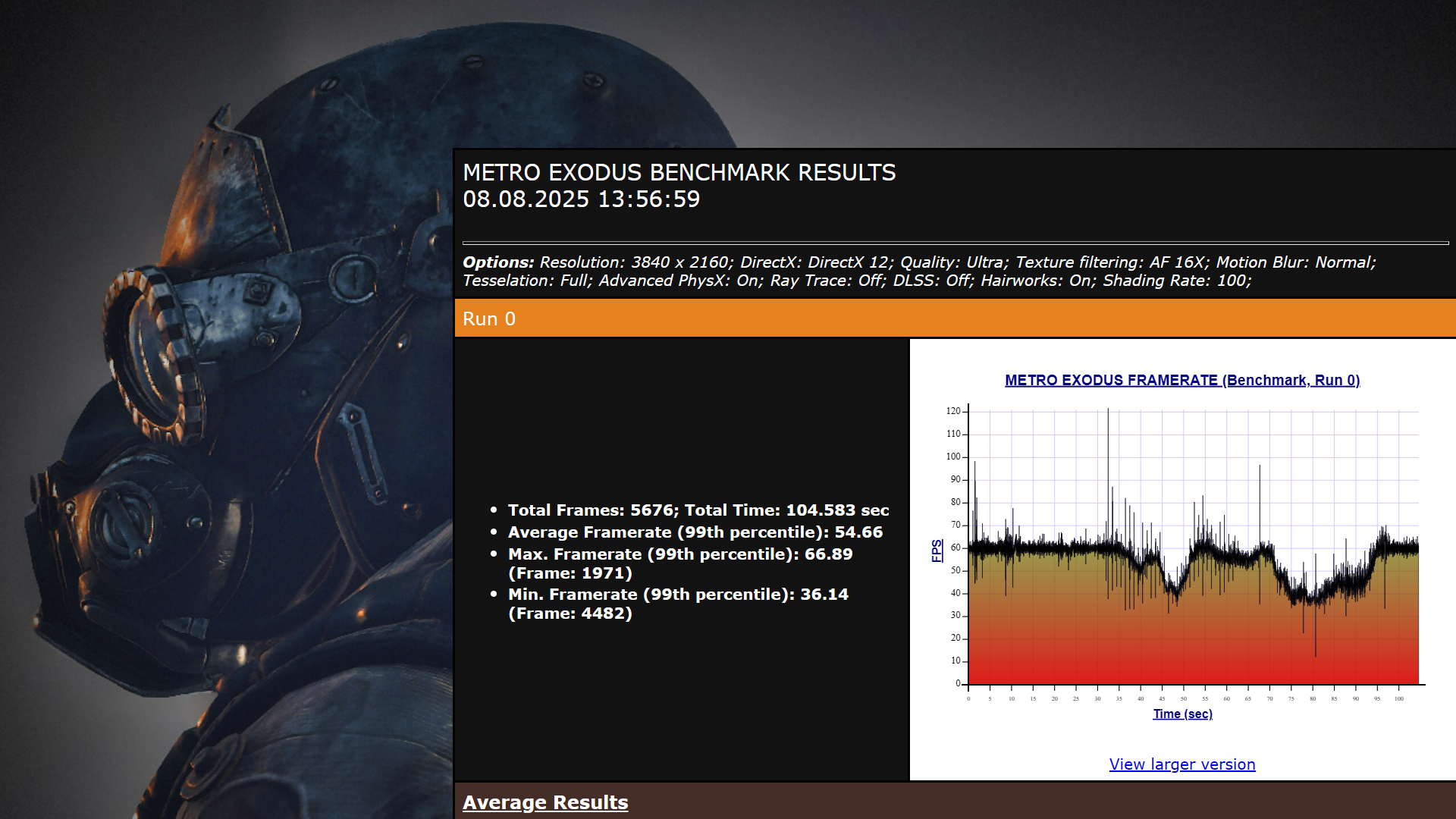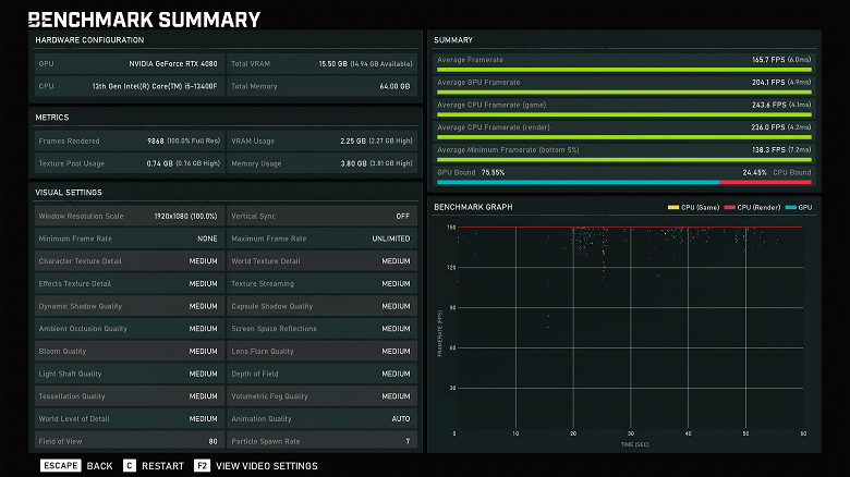 На экране отчета фиксируем средний fps (Average Framerate) и минимальный fps (Average Minimum Framerate).