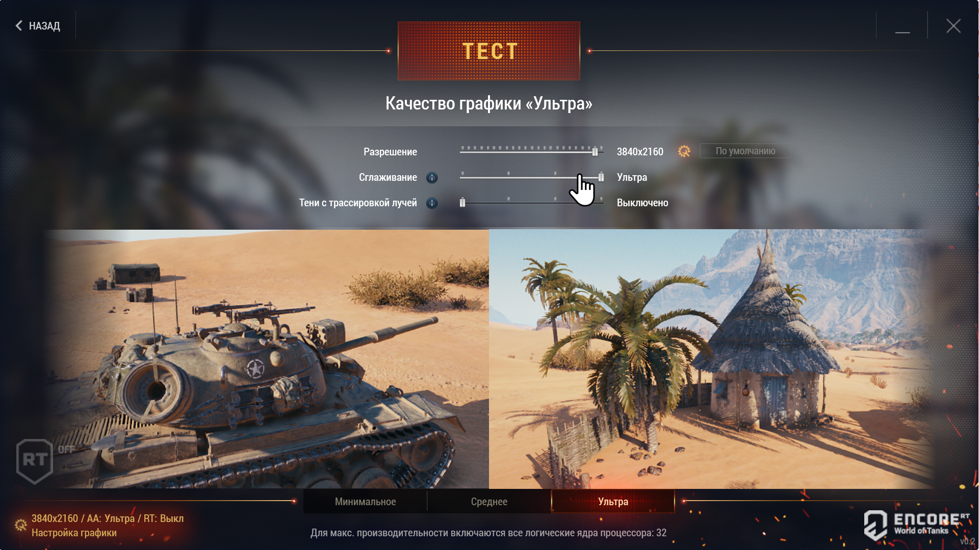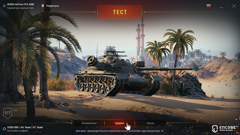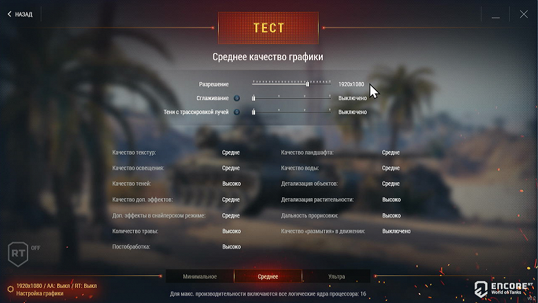 После загрузки бенчмарка World of Tanks выбираем на нижней вкладке пресет «Среднее» (качество). Кликаем в левом нижнем углу на показатели разрешения и RT.
