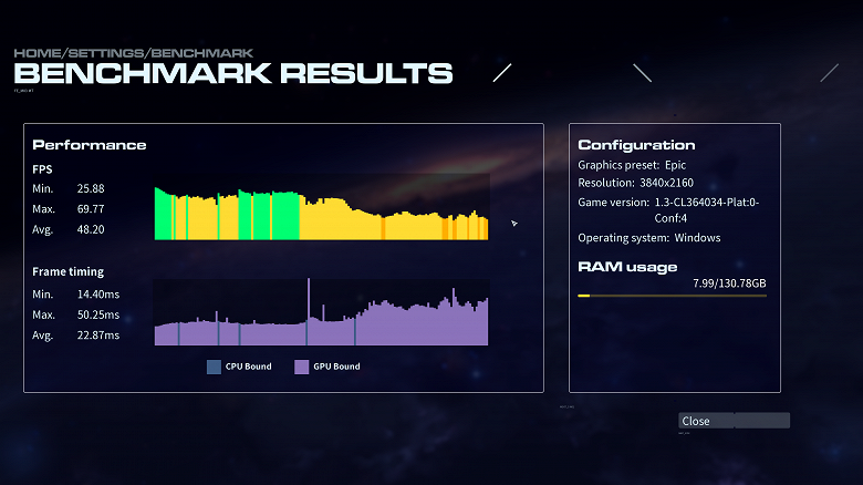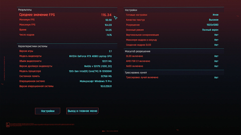 Встроенный бенчмарк рассчитывает собственные баллы. Для получения требуемых показателей fps мы используем MSI Afterburner (как в случае с Forspoken).