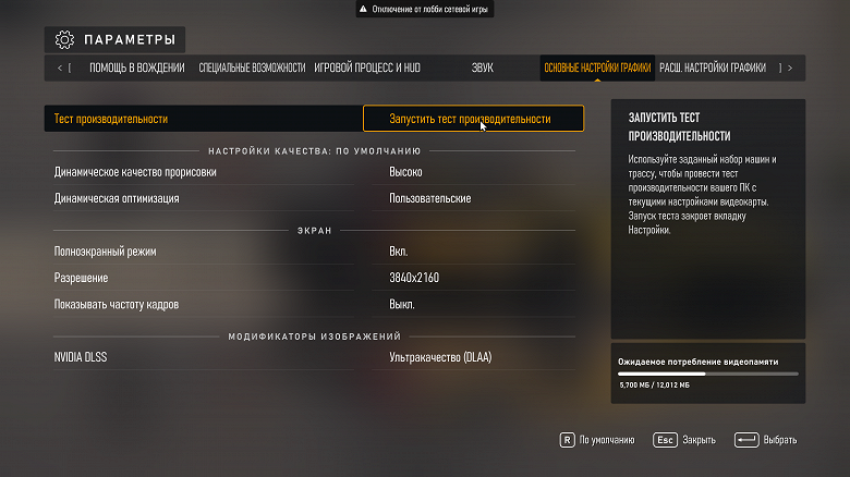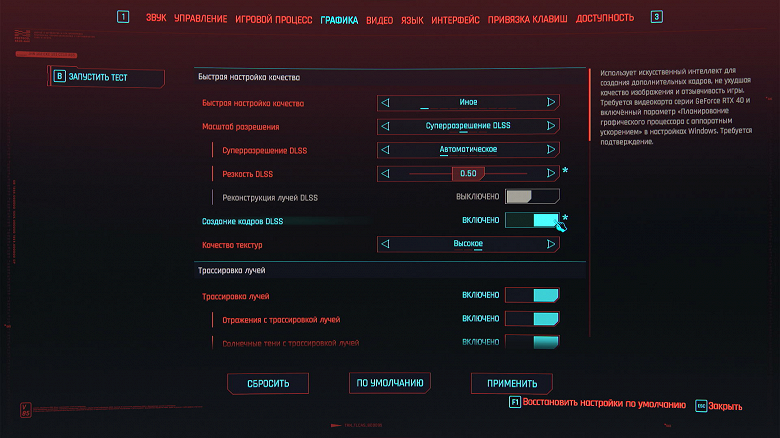 В предыдущей серии тестов трассировка лучей и DLSS были выключены. Оставляем «Создание кадров DLSS» в том же положении (Выкл.).