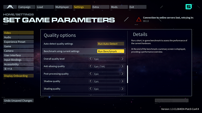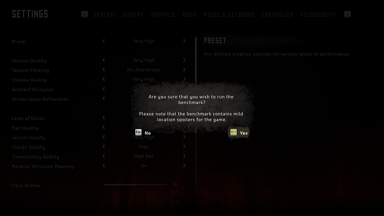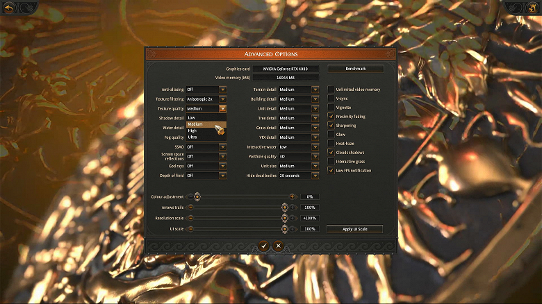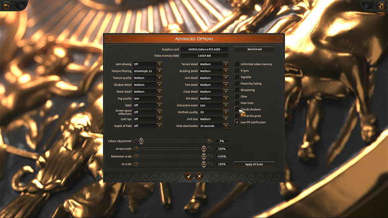Снимаем отметки с опций Proximity fading, Sharpening, Clouds shadows. Запускаем бенчмарк кликом на кнопку в правом верхнем углу окна (Benchmark).