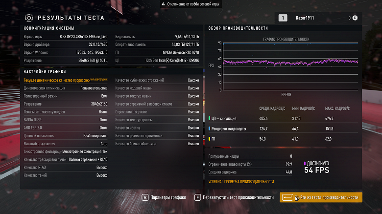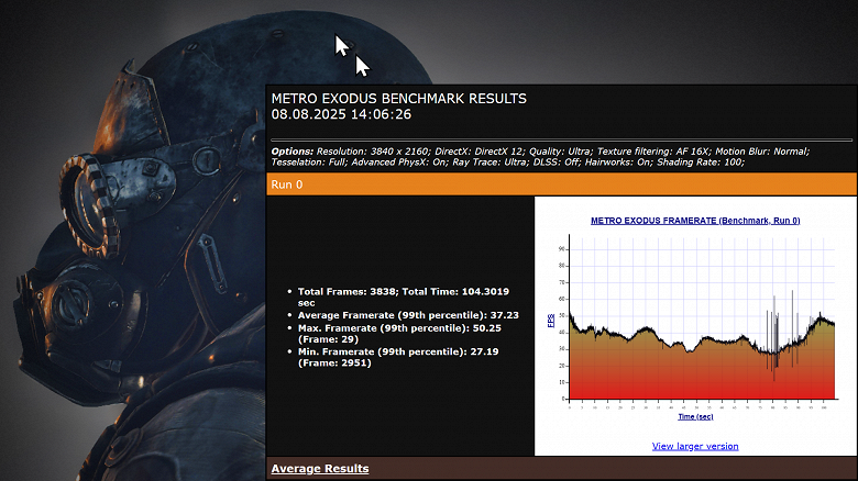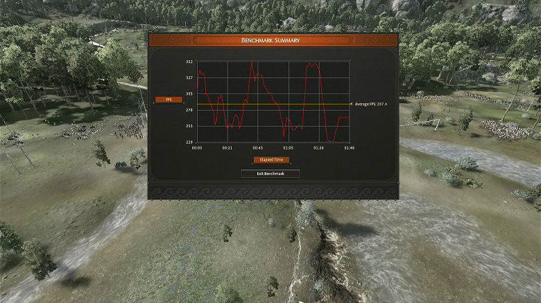 По завершении прогона учитываем средний fps (Average FPS) и минимальный fps (минимальное значение по оси абсцисс).