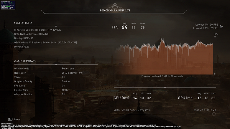 По окончании тестового прогона считываем показатели FPS avg (средний) и Lowest 1% (минимальный).