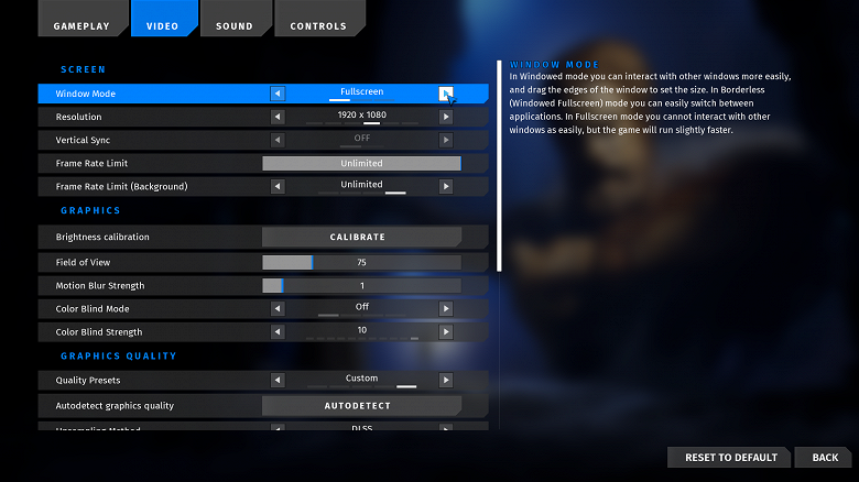 Отключаем ограничение FPS (FPS Limit → Off). Window Mode меняем на Fullscreen. Aspect Ratio (соотношение сторон) и Resolution устанавливаем в соответствии с условиями испытаний.