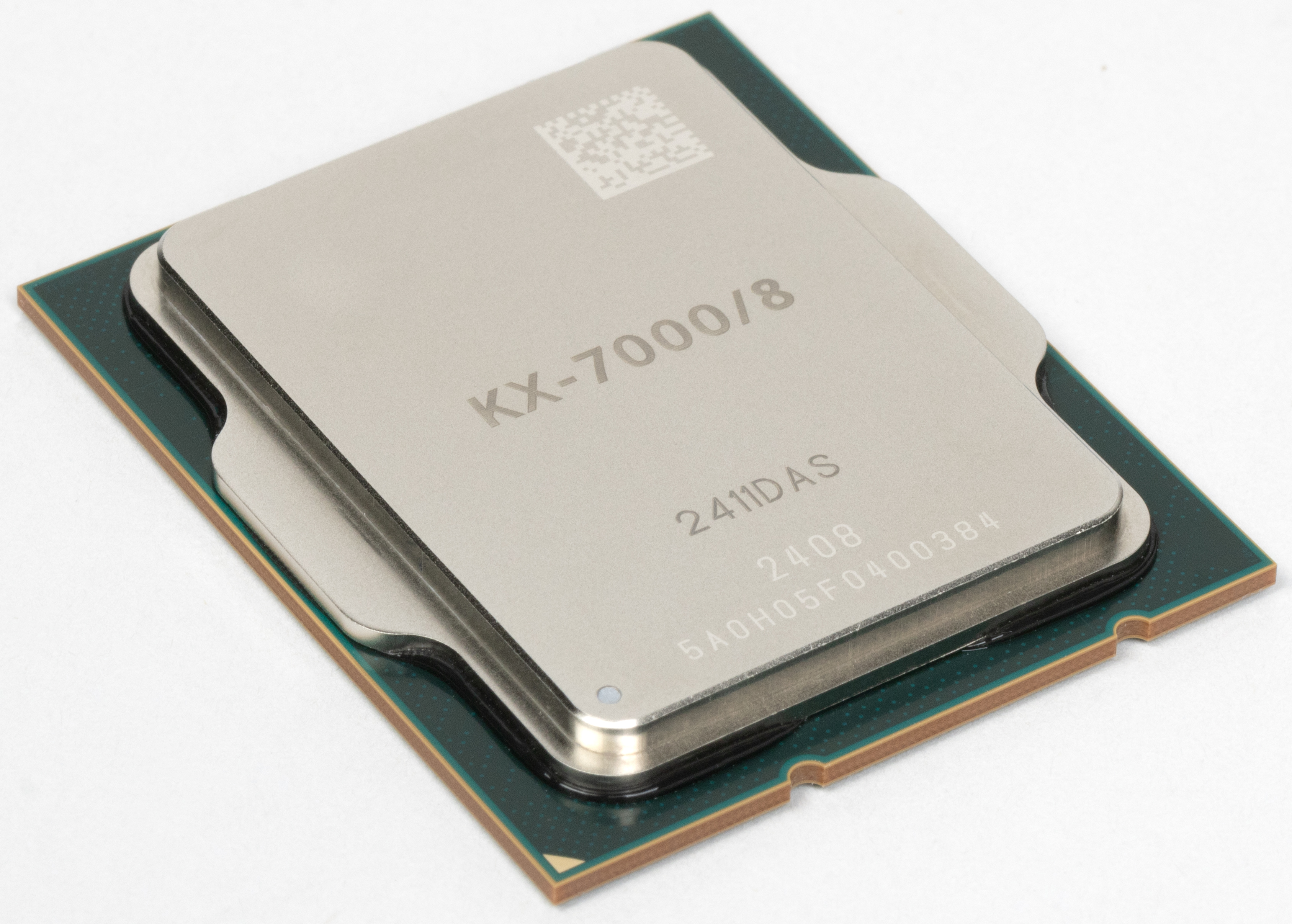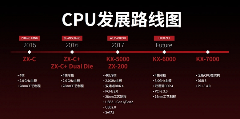 В этом настольном CPU компания смогла реализовать поддержку DDR5 и PCIe 4.0, а вот техпроцесс остался тем же 16 нм — переходу на более современный снова помешали санкции в отношении китайских компаний, запрещающие им доступ к современному полупроводниковому производству. Именно это не дало повысить частоту выше 3,2—3,7 ГГц, чтобы получить более высокую производительность, а также задержало выход решения на рынок. В остальном, по спецификациям KX-7000 неплох, он имеет встроенное графическое ядро ZX-C1190, поддерживающее DirectX 12, OpenGL 4.6 и OpenCL 1.2, аппаратное кодирование и декодирование видеоданных в 4K-разрешении и распространенных форматах H.265/H.264, и способное выводить 4K-изображение по разъемам DisplayPort, HDMI и VGA. Поддерживаются китайские национальные стандарты аппаратного шифрования SM2, SM3 и SM4, а также расширенные наборы инструкций SSE4.2, AVX, AVX2.
