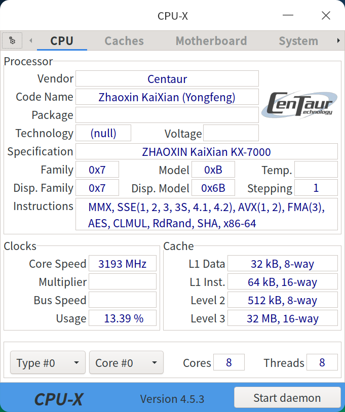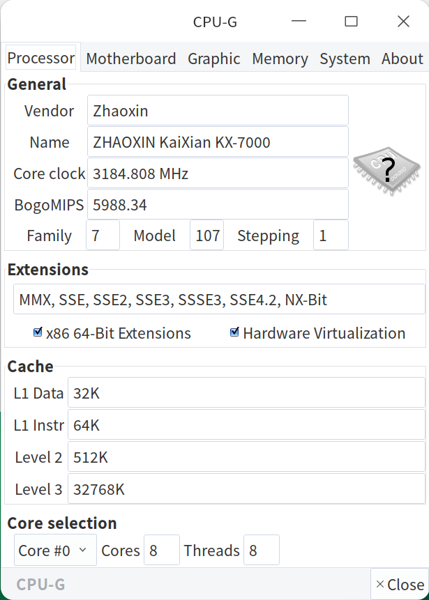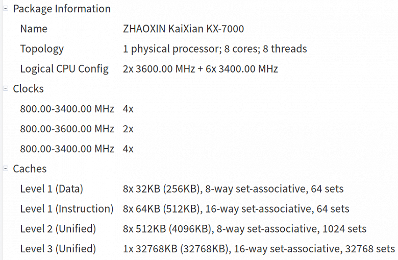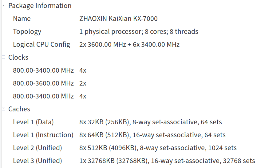 Все основные данные на экране есть, CPU-X дает их чуть больше, хотя некоторые страницы утилит выдали некорректные сведения, а бывает и так, что подобное системное ПО вовсе аварийно завершало работу при попытке их получить и отобразить, поэтому данные о CPU всё же неполные — сравнительно малая распространенность китайского процессора Zhaoxin дает о себе знать. Дополнительно интересна информация о том, на какие частоты способны соответствующие ядра — эту информацию обеспечила утилита HardInfo, в частности: