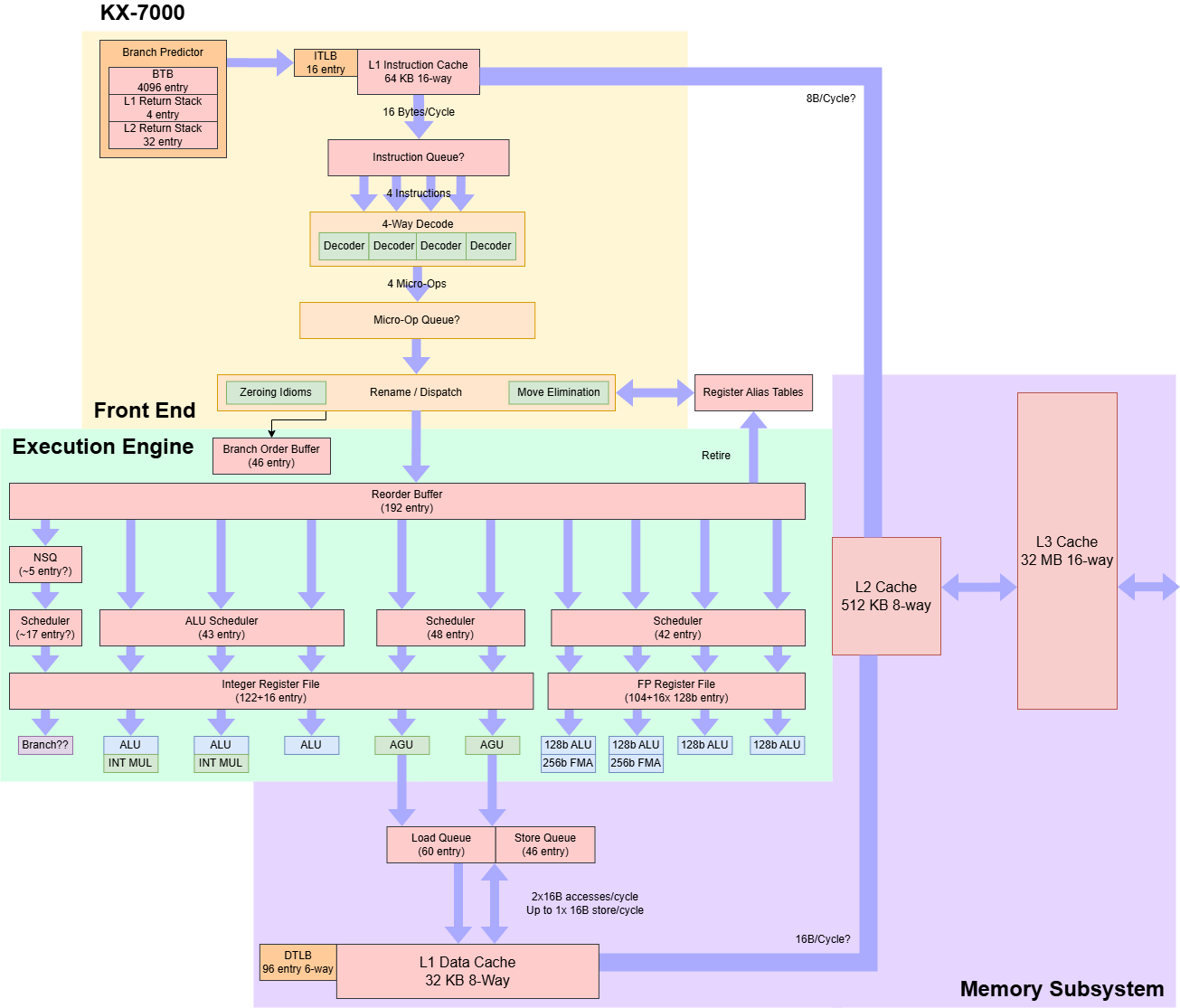 Внешний интерфейс KX-7000 выбирает инструкции из кэша инструкций объемом 64 КБ, который может выдавать по 16 байт за такт, подавая данные в 4-байтовый декодер. Архитектура Century Avenue не использует кэш операций или буфер циклов, и пропускная способность кэша инструкций может ограничивать общую производительность, которая резко снижается при выходе кода за пределы кэша инструкций, также производительность снижается, когда код попадает в L3-кэш — до менее чем 4 байт за такт. А ведь даже древний Skylake может выполнять код из L2-кэша со скоростью более 12 байт за такт, исполняя более чем три 4-байтовые инструкции за такт.