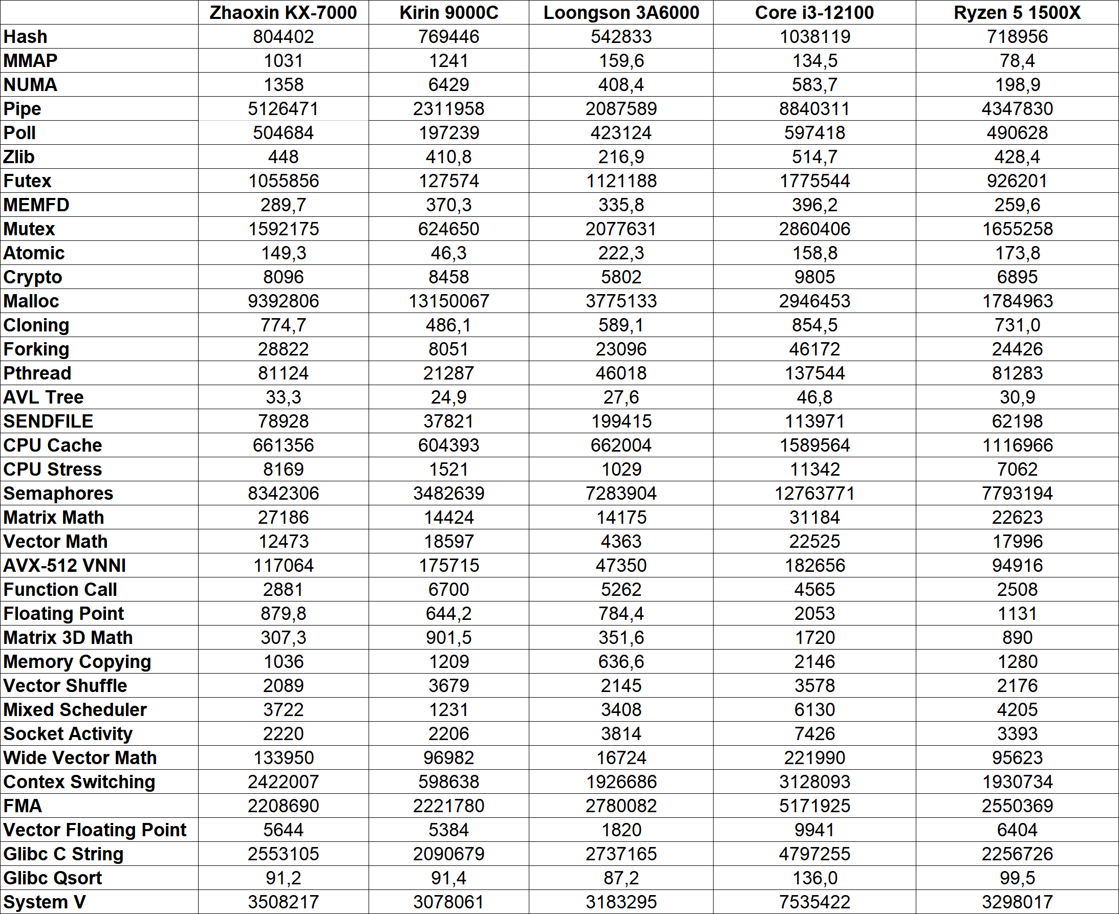 Если бы не Loongson, то Zhaoxin снова стал бы самым медленным процессором сравнения, и если у первого есть отмазка в виде потенциального недостатка оптимизации, то у x86-совместимого CPU ее нет. KaiXian KX-7000 на 20% быстрее Loongson 3A6000, но Kirin 9000C смог обойти сегодняшнего героя на приличные 55%. Даже Ryzen 5 1500X не столь быстр, он впереди Zhaoxin на 40%, а вот Core i3-12100 — самый быстрый процессор сравнения (в очередной раз) и он в 2,5 раза быстрее очередного китайского CPU.