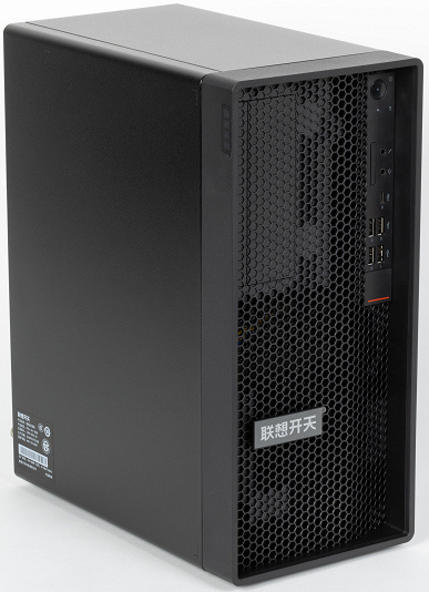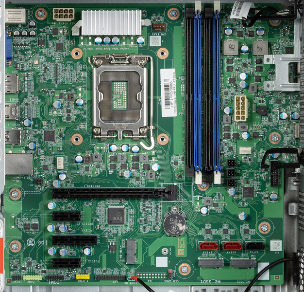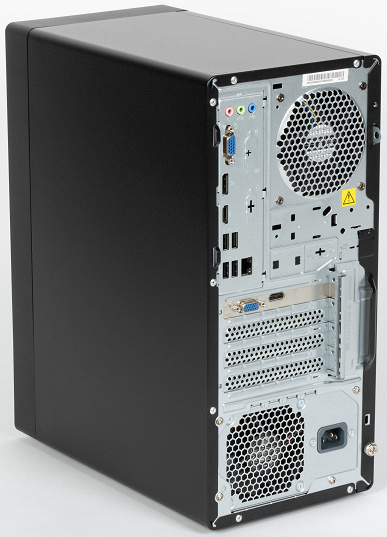 Что касается набора разъемов, то система имеет спереди: один разъем USB-C, четыре разъема USB-A, отдельные аудиоразъемы 3,5 мм для наушников и микрофона, а сзади: видеоразъемы VGA, HDMI и DisplayPort, четыре разъема USB-A, гигабитный разъем RJ45, аудиоинтерфейс (микрофон, стереовыход, аудиовход). Встроенной поддержки беспроводных сетей Wi-Fi и Bluetooth нет, но ее легко установить при помощи дополнительного модуля в соответствующий разъем M.2 — возможно, в каких-то конфигурациях этого ПК он уже предустановлен в системную плату.