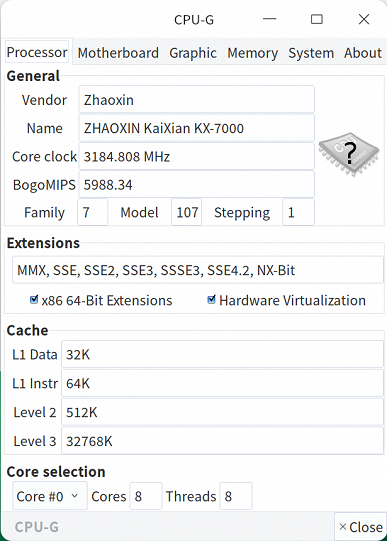 Поговорим об организации и возможностях KaiXian KX-7000. Общий объем его L1-кэша составляет 768 КБ (64 КБ на ядро для инструкций и 32 КБ на ядро для данных), L2-кэша имеется по 512 КБ на ядро (всего 4 МБ), есть и общий L3-кэш объемом 32 МБ. В процессорах Zhaoxin кэш третьего уровня появился впервые, и из-за его появления решили вдвое снизить объем L2-кэша. Базовая частота вычислительных ядер составляет 3,2 ГГц, максимальная — 3,6-3,7 ГГц. Но последняя достижима не для всех ядер одновременно, при многопоточной нагрузке два лучших ядра работают на частоте до 3,6 ГГц, а остальные шесть — до 3,4 ГГц, а средняя частота получается 3,45 ГГц. К слову, ядра KX-7000 всё так же не поддерживают одновременную многопоточность (SMT), как и предыдущие решения компании, но как минимум в этом догонять отказавшуюся от этой технологии Intel им уже не нужно.