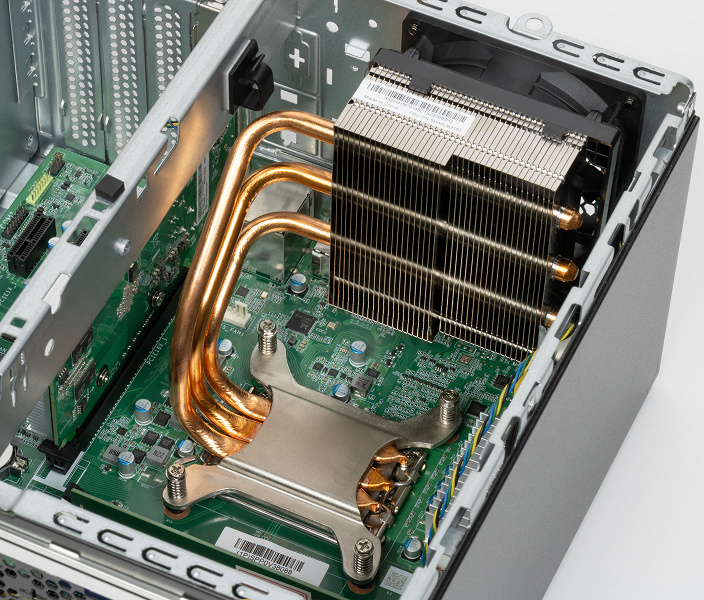 В отличие от ранее рассмотренных нами систем на основе китайских процессоров, для охлаждения KaiXian KX-7000 как минимум в случае ПК Lenovo используется уже не самая простая система охлаждения минимального размера, а решение с довольно большими радиатором и вентилятором, вынесенными к задней стенке корпуса, а для отведения тепла от процессора к радиатору используется теплосъемная пластина, соединенная с ним тремя медными тепловыми трубками. Этот кулер явно мощнее, вероятно в том числе из-за него Lenovo пришлось использовать такой широкий корпус объемом в 17 литров.