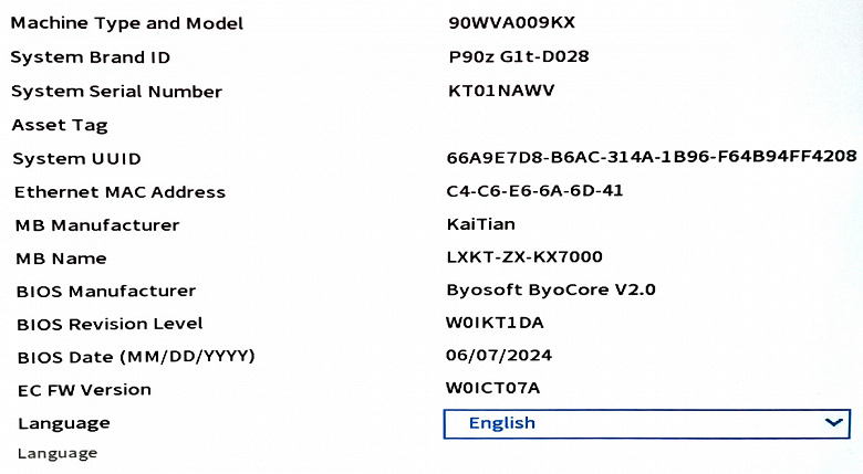 К сожалению, применяемая системная плата KaiTian LXKT-ZX-KX7000 имеет очень скудные возможности по настройке в BIOS Setup, никакого разгона и изменения важных для производительности параметров среди них нет, так что даже заходить в настройки особого смысла не имеет. Разве что основные данные о конфигурации ПК из них получить можно, да и то в очень кратком виде. Особенно нам бы помогла настройка частоты работы и таймингов DDR4-памяти, но ее в меню не оказалось, как и многих других привычных по решениям AMD и Intel параметров.