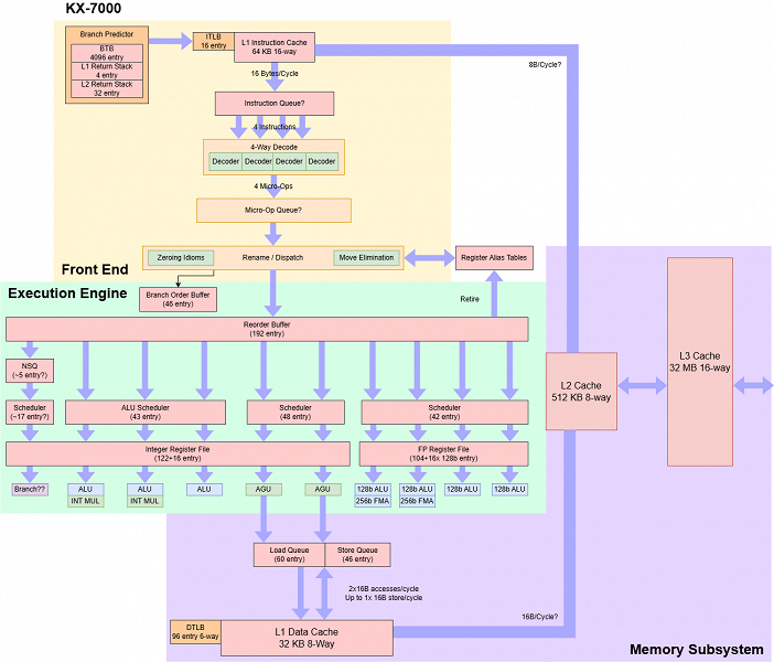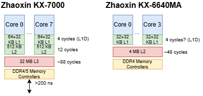 При теоретически неплохих возможностях кэшей KX-7000, они имеют низкие тактовые частоты и относительно низкую пропускную способность на ядро — даже у Zen 2 пропускная способность L3-кэша более чем вдвое выше. И даже при том, что KX-7000 имеет более высокую пропускную способность L3-кэша, чем Skylake-X, последний имеет больший объем L2-кэша в 1 МБ, что позволяет ядрам чаще избегать обращений к данным в L3-кэше. А тот же Bulldozer хоть и имеет схожую задержку при обращении к L3-кэшу, но имеет еще больший его объем.