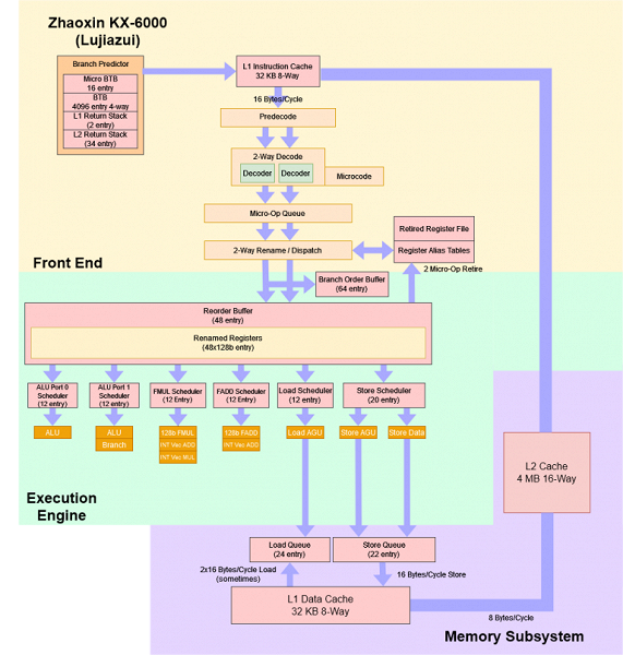 В LuJiaZui сузили ширину декодирования с 3 (в Isaiah) до 2 команд, так как хотели добиться более высокой тактовой частоты, снижения энергопотребления и уменьшения площади на кристалле. Иначе создать восьмиядерный чип с приемлемым энергопотреблением и площадью кристалла у Zhaoxin не получилось — более широкое ядро, работающее на более низких тактовых частотах, не всегда работает лучше, такое же решение для повышения энергоэффективности мы видели ранее в процессоре ARM Cortex-A73 по сравнению с Cortex-A72, так что китайцы сделали логичный ход. В LuJiaZui также сократили размер буфера переупорядочивания ROB с 65 до 48 записей, инженеры отказались от отдельных регистровых файлов в Isaiah и вернулись к ROB+RRF, хотя современные высокопроизводительные процессоры используют регистровые файлы, отделенные от ROB.