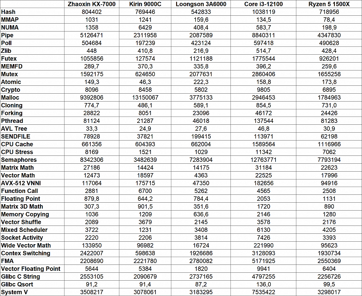 Увы, но радоваться нам снова нечему, в этом тесте результат KaiXian KX-7000 оказался снова хуже всех. Zhaoxin уступил процессору Loongson 3A6000 до 36%, в зависимости от подтеста, хотя в одном из них даже выиграл. Kirin 9000C также впереди нашего героя — на 208%, 39% и 68% соответственно. Западные CPU еще быстрее, Ryzen 5 1500X не слишком сильно обошел процессор Huawei, а вот Core i3-12100 быстрее Zhaoxin KaiXian KX-7000 в 4 раза в первом подтесте, в 2,7 раза во втором и почти в 3 раза в третьем. Так что по количеству исполняемых за такт инструкций в этом тесте x86-совместимый китайский CPU далек даже до Zen 1, достать даже таких западных «старичков» снова не получилось.